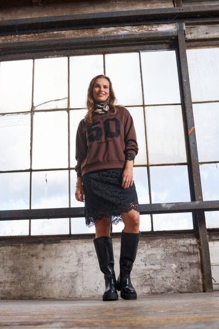 Zwarte rok van Marta du Château met kantpatroon in een bloemrijk design. De rok heeft een schelpvormige zoom en is knielang.
