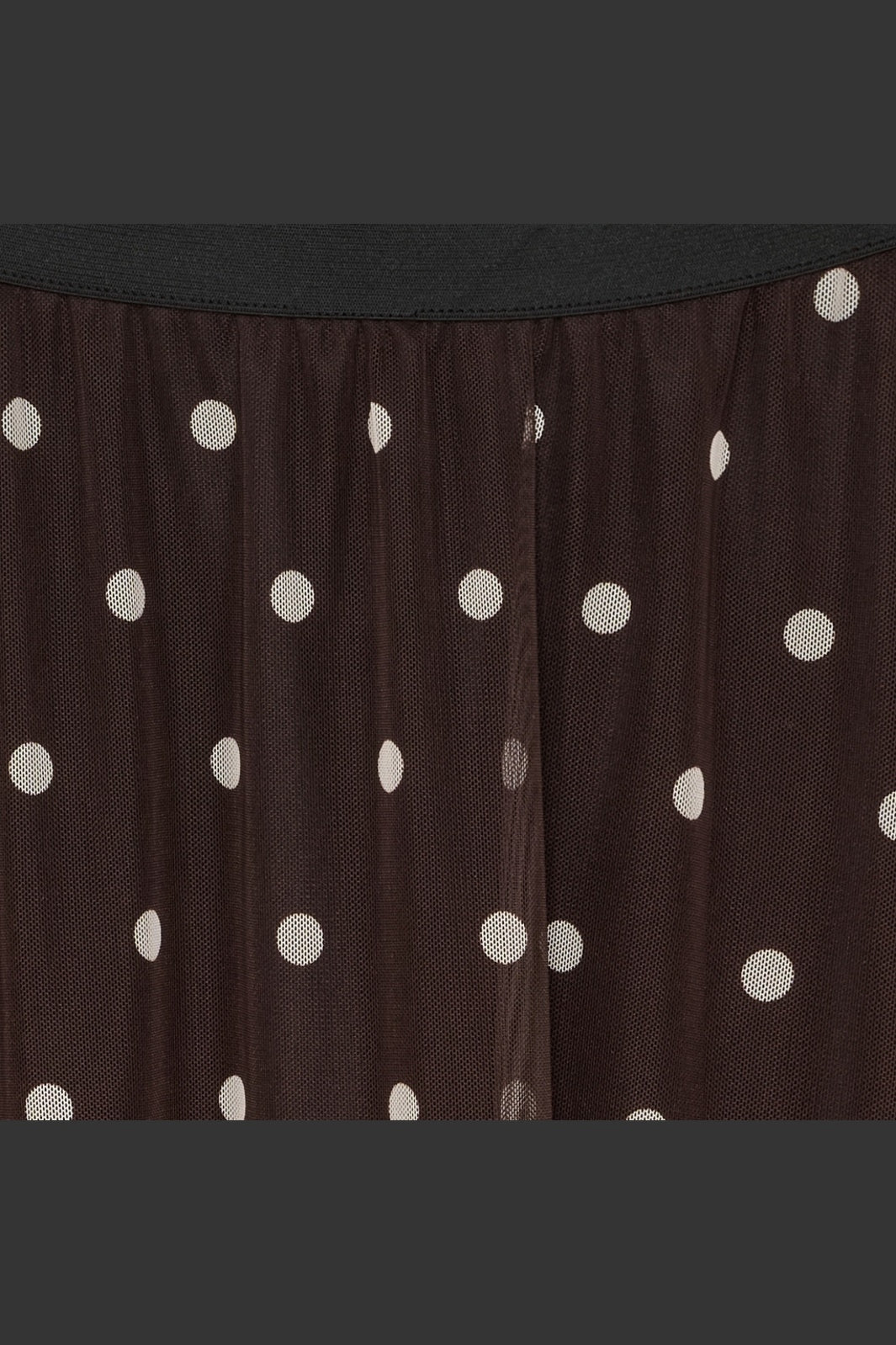 Bruine rok van Marta Du Chateau met witte stippen. Hij is gemaakt van lichte polyester met een elastische tailleband en komt tot halverwege het onderbeen.