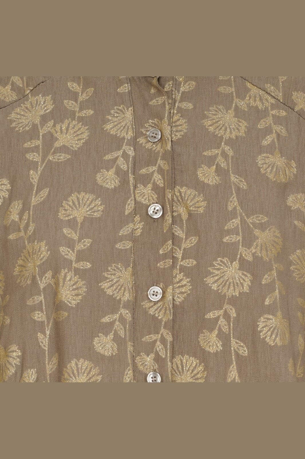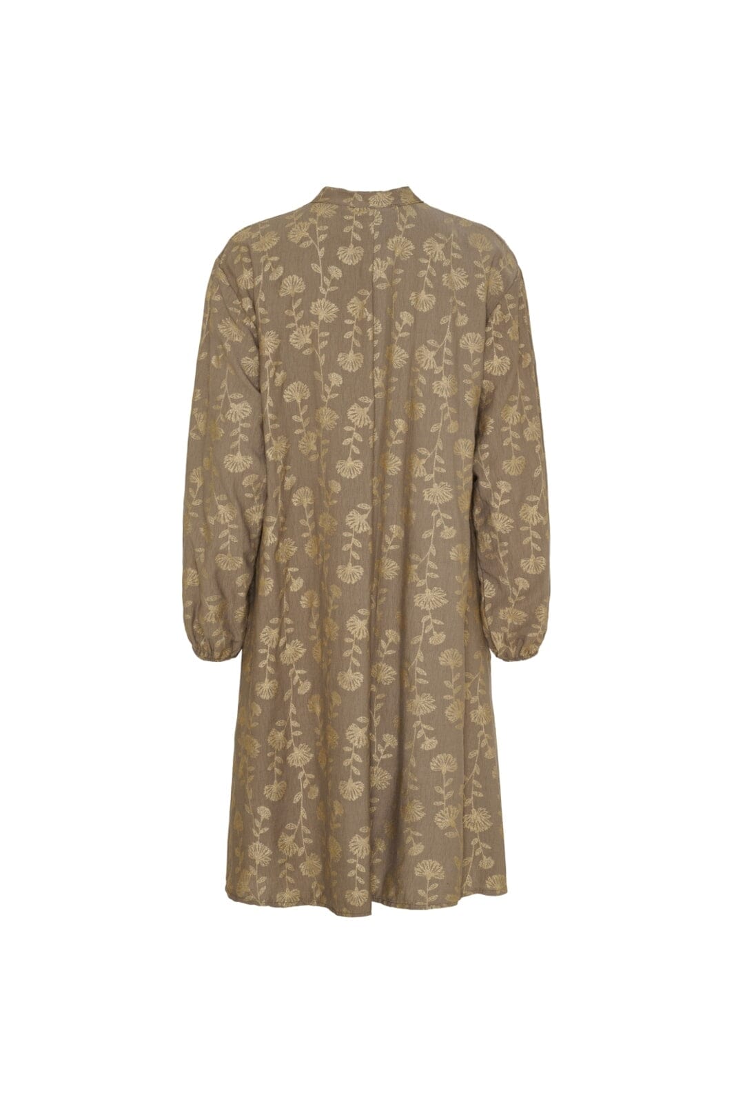 Knielange jurk van Marta Du Chateau in bruin met gouden bloemenpatroon. De jurk heeft lange mouwen met elastiek en een doorlopende knoopsluiting met een kleine kraag.