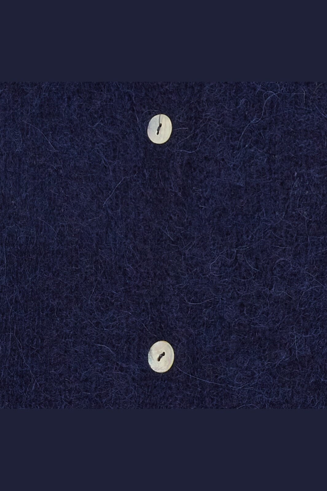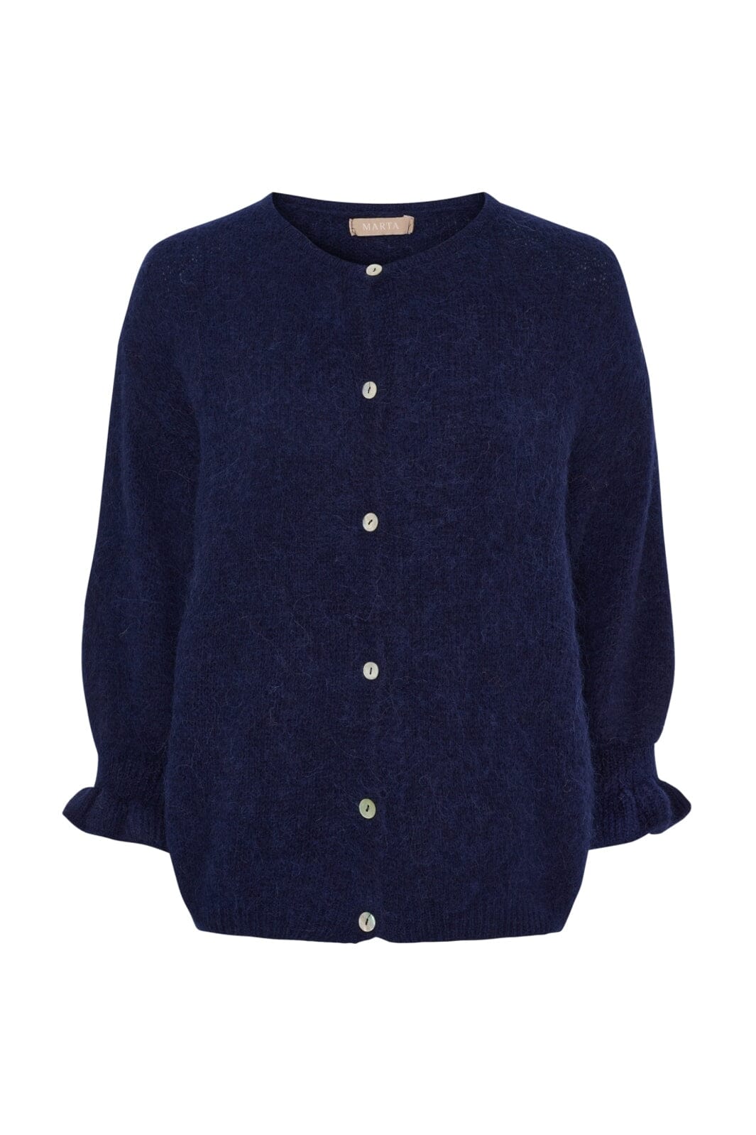 Donkerblau gebreide cardigan van Marta Du Chateau met ronde hals en knopen aan de voorkant. De cardigan heeft 3/4-mouwen met gerimpelde manchetten.