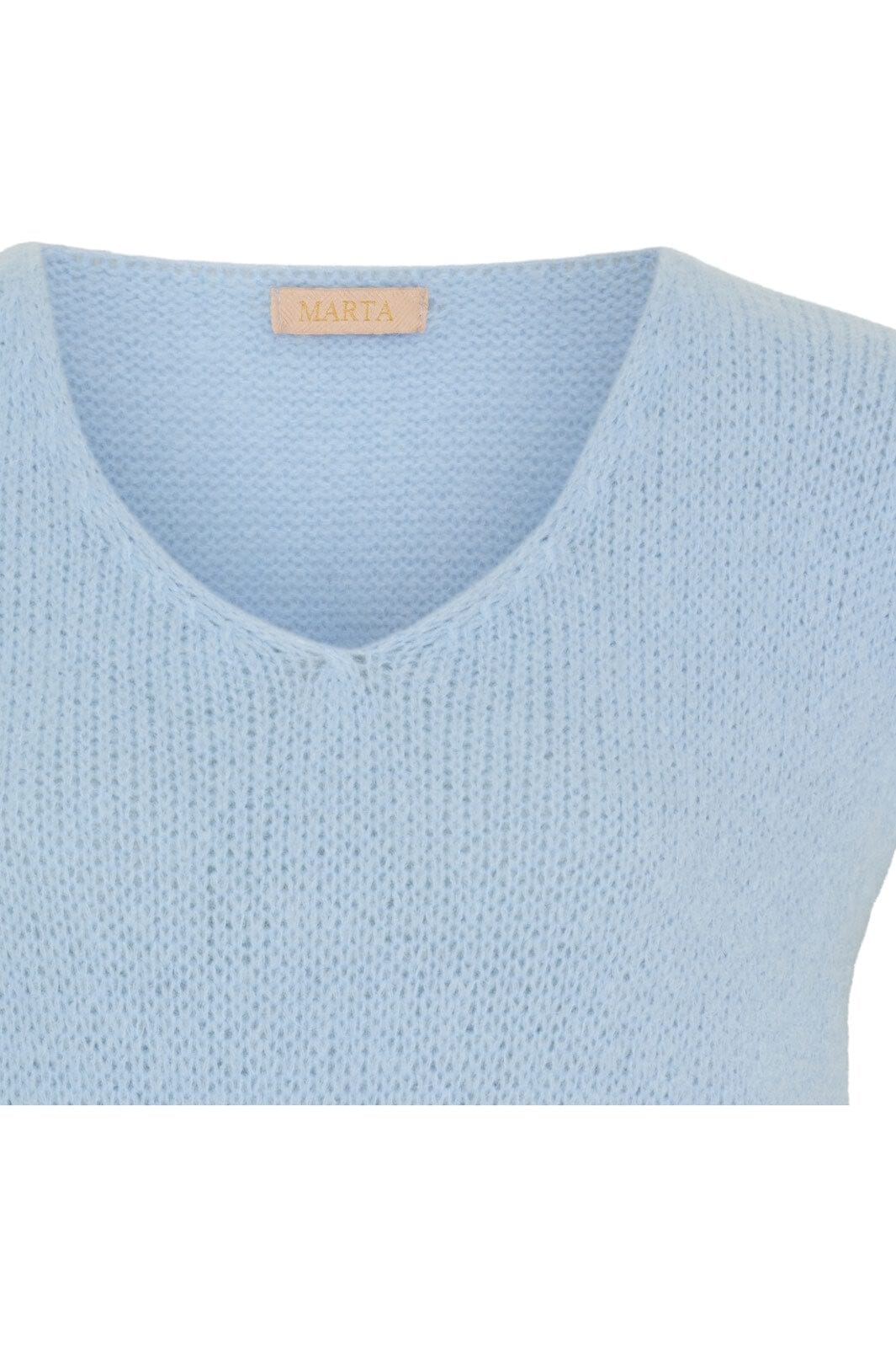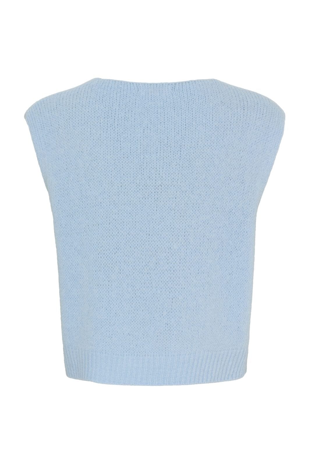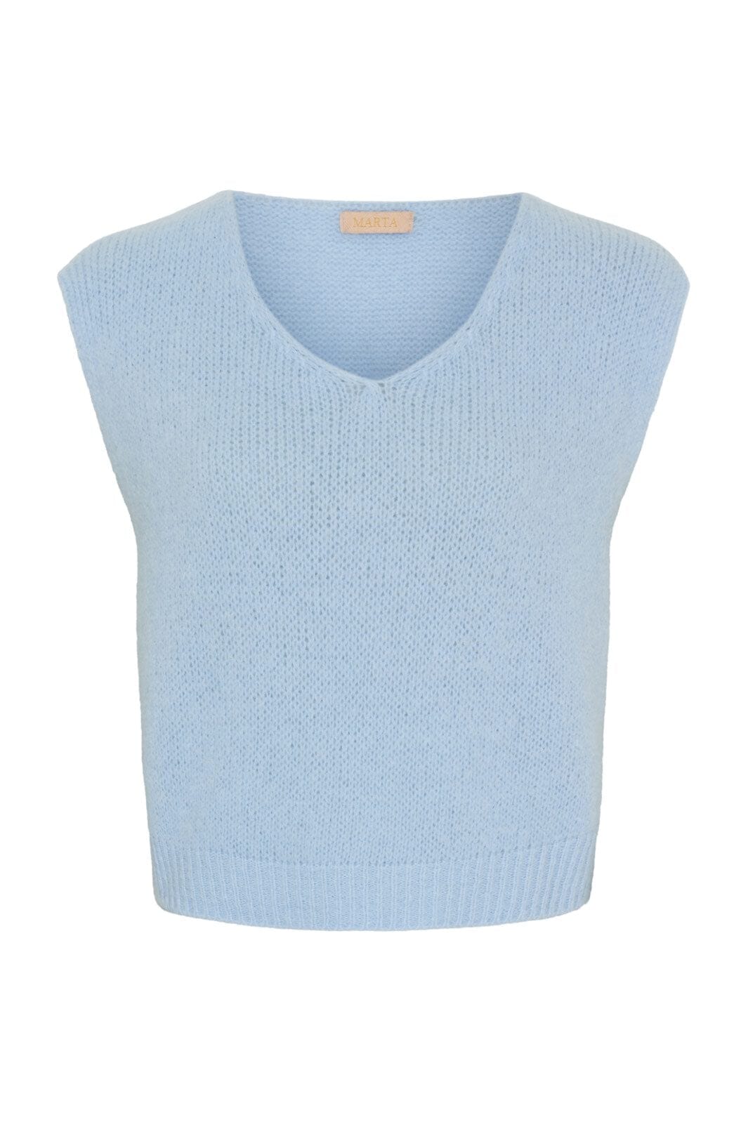 Mouwloze vest van Marta Du Chateau in een luchtblauwe kleur. De vest heeft een V-hals en een gebreide structuur met een ribbelrand aan de onderkant.
