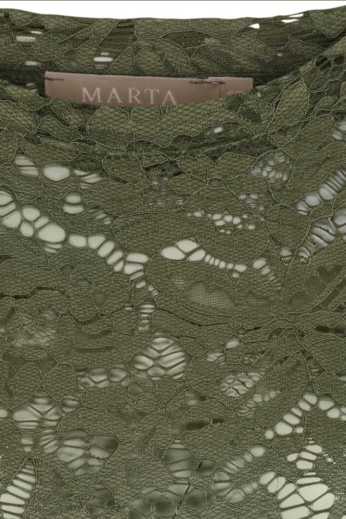 Lange mouw T-shirt van Marta Du Chateau in militairgroen met een bloemachtig kantpatroon over de hele blouse. De blouse heeft een ronde hals en geschulpte boorden.