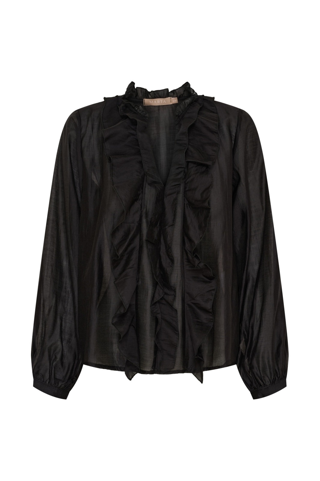 Zwarte blouse van Marta Du Chateau met V-hals en ruchesdetails. De blouse heeft lange mouwen en is gemaakt van een licht, doorzichtig materiaal met ruches langs de halslijn.