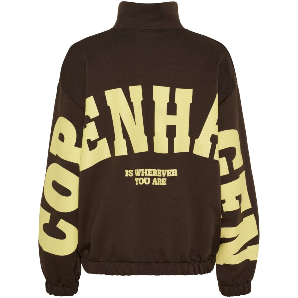 Donkerbruine cardigan van Marta Du Chateau met gele details. De cardigan heeft een ritssluiting aan de voorkant en elastische boorden. Hij is geschikt voor zowel ontspannen als actieve gelegenheden.