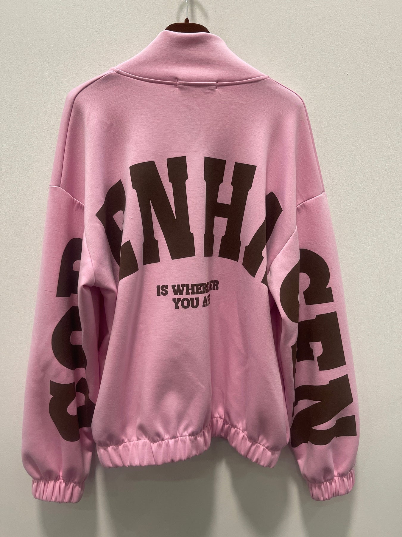Roze vest van Marta Du Chateau met bruine tekstprint. Het vest heeft een hoge kraag en een ritssluiting aan de voorkant in een roze/bruine kleurcombinatie.