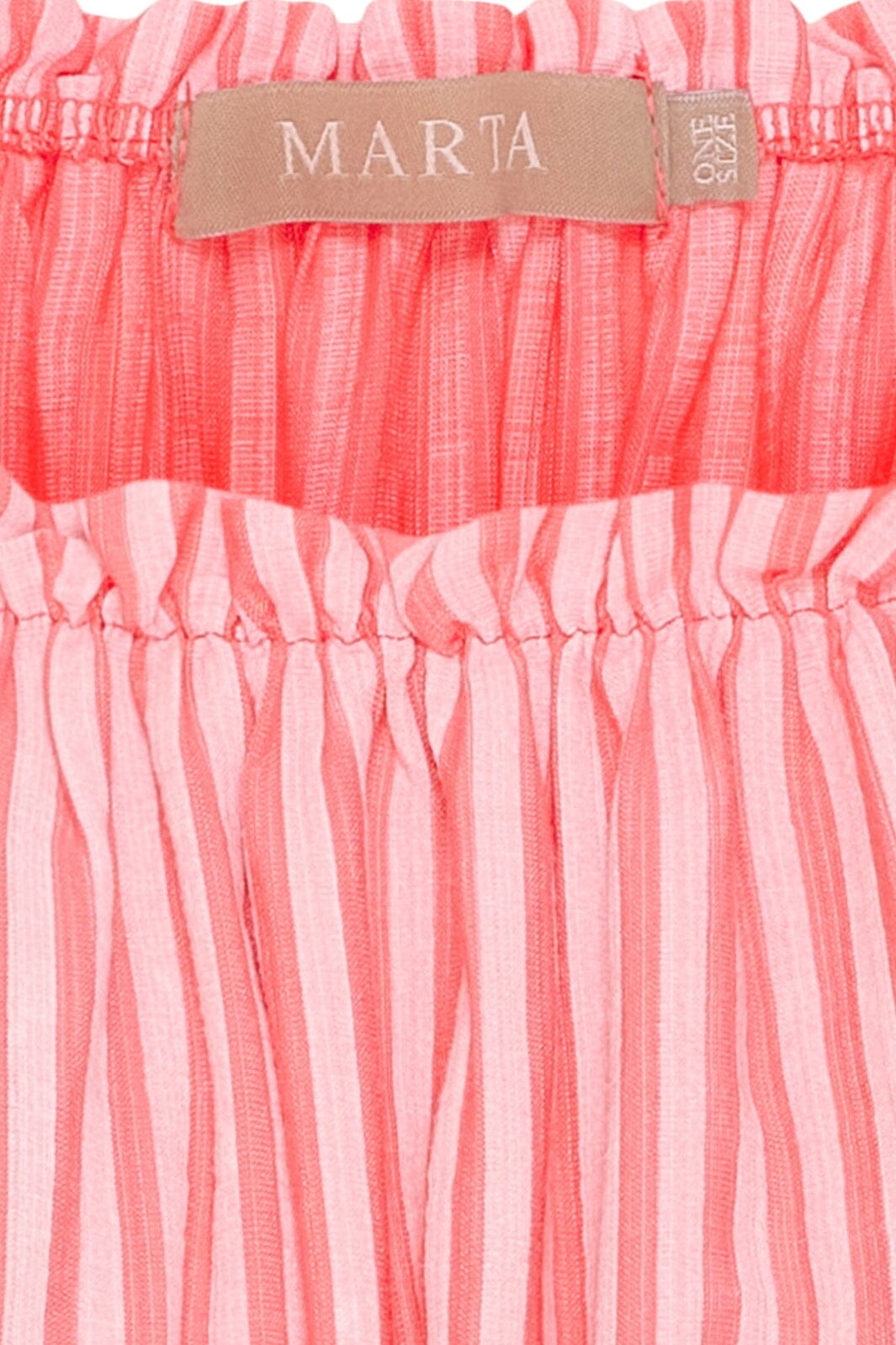 Gestreepte jurk van Marta Du Chateau in roze en wit. Het heeft een elastische halslijn voor off-shoulder gebruik en 3/4 klokmouwen met ruches.