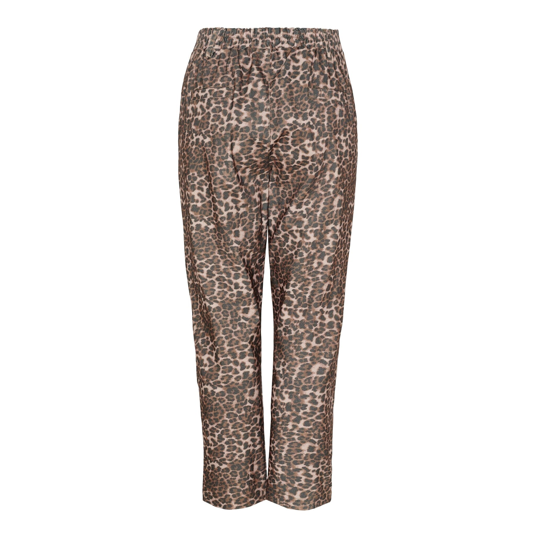 Broeken van Marta Du Chateau met bruin luipaardpatroon. De lange broeken hebben zakken aan de voorkant en een combinatie van rits en elastiek in de taille.