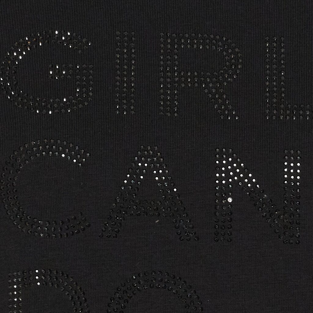 Zwarte T-shirt van Marta Du Chateau met de tekst GIRLS CAN DO ANYTHING in kleine, glinsterende pailletten op de voorkant. Het T-shirt is geschikt voor zowel casual dagelijks gebruik als thuisgebruik.