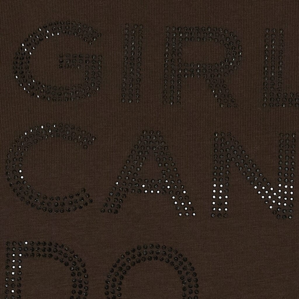 Een donkerbruin T-shirt van Marta Du Chateau met de tekst GIRLS CAN DO ANYTHING in glanzende pailletten op de voorkant.