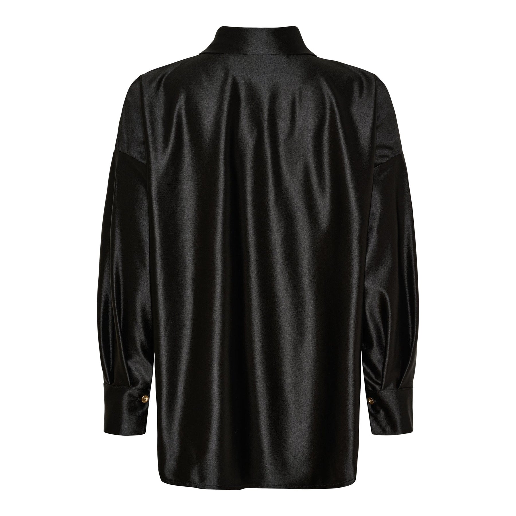 Zwarte blouse van Marta Du Chateau met glanzend oppervlak. De blouse heeft een klassieke kraag, oversized pasvorm en lange mouwen met knoopsluiting.