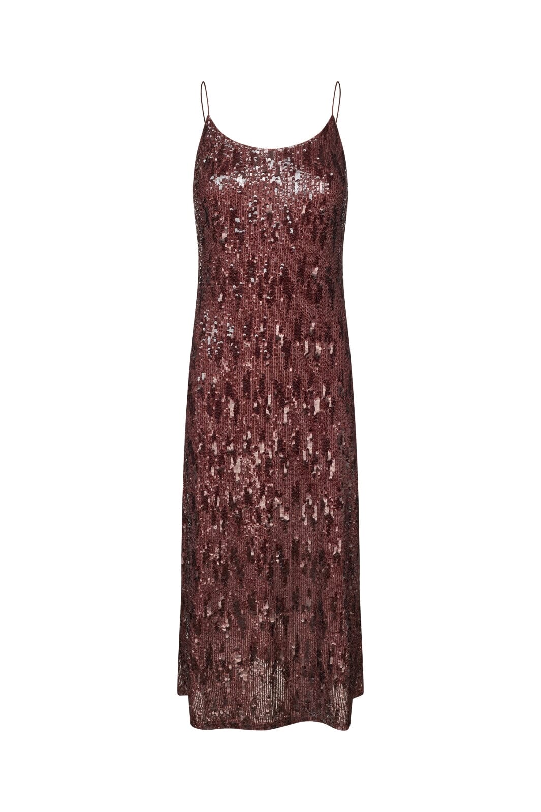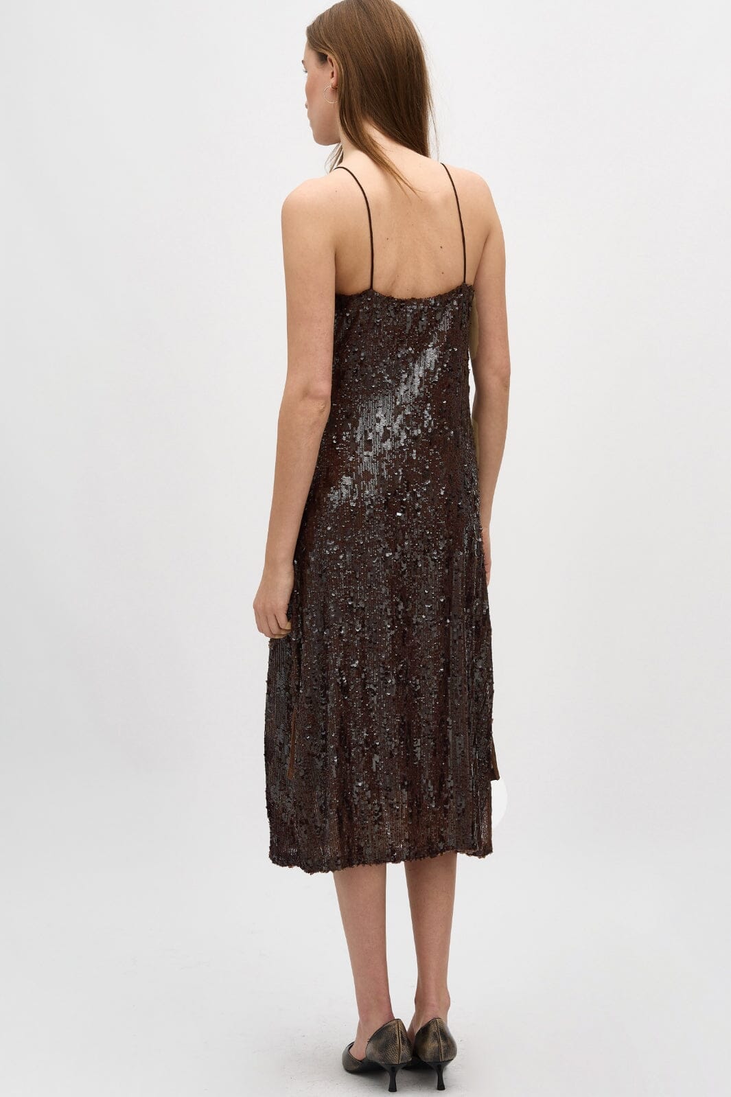 Bruine paillettenjurk van MbyM met dunne bandjes. De jurk heeft een rechte silhoët en komt tot halverwege de kuit. De bruine tint heet Chocolate Martini, en de pailletten creëren een glanzend oppervlak.