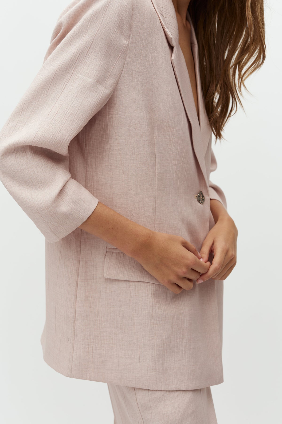 Een lichtroze blazer van MbyM met een gemêleerd patroon. De blazer heeft een enkele knoopsluiting en twee voorzakken met klep.