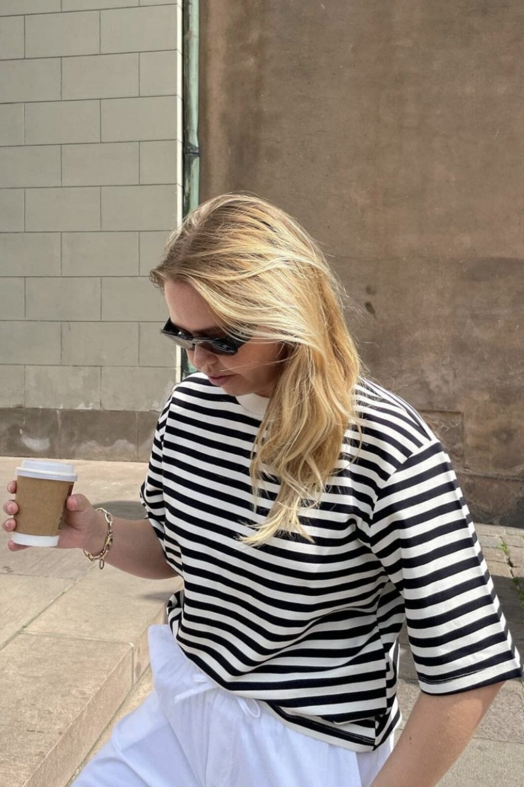 Gestreept T-shirt van MbyM met brede strepen in marineblauw en wit. Het T-shirt heeft een losse pasvorm en korte mouwen met een ronde hals.
