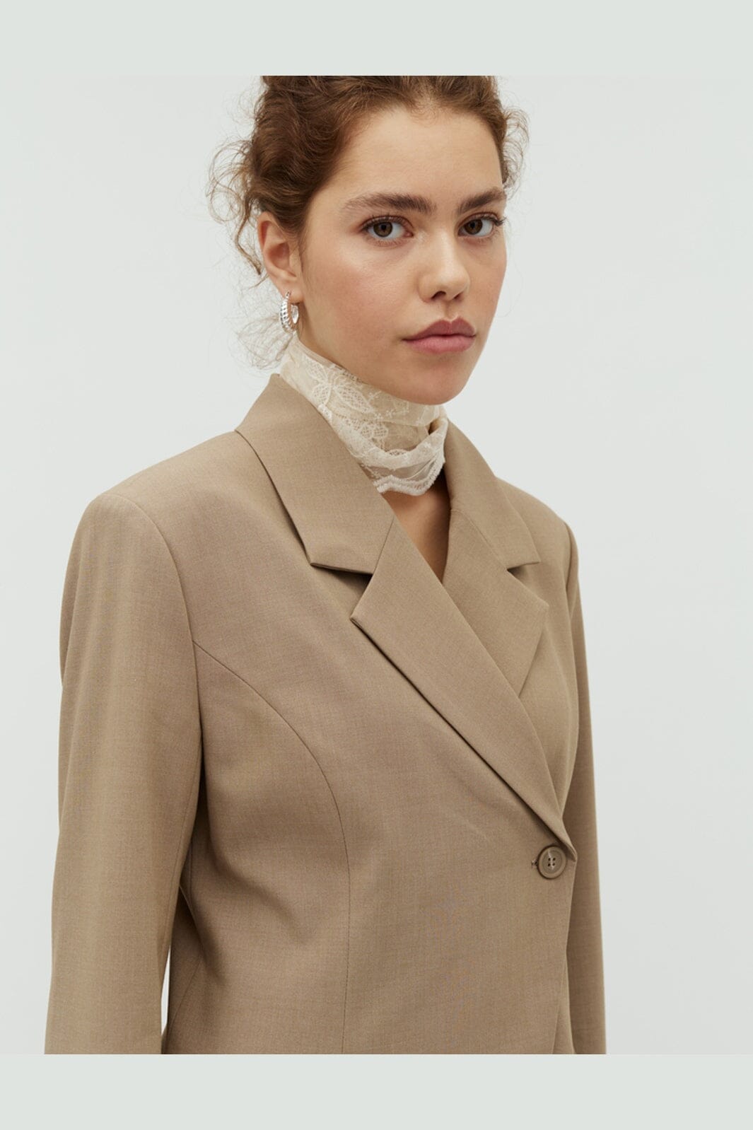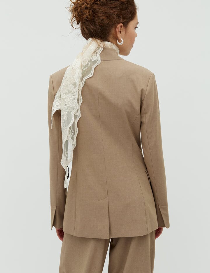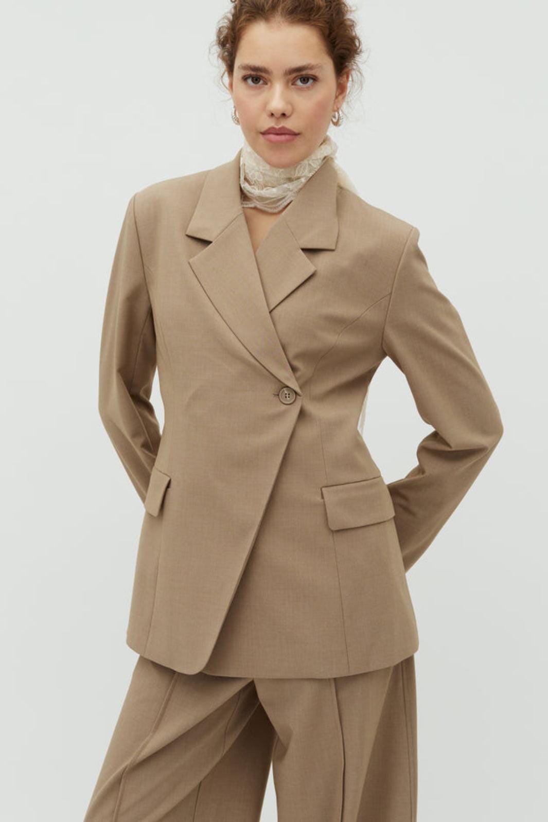 Blazer van MbyM in een lichtbruin gemêleerde tint. De blazer heeft lange mouwen, een V-hals en een knoopsluiting.