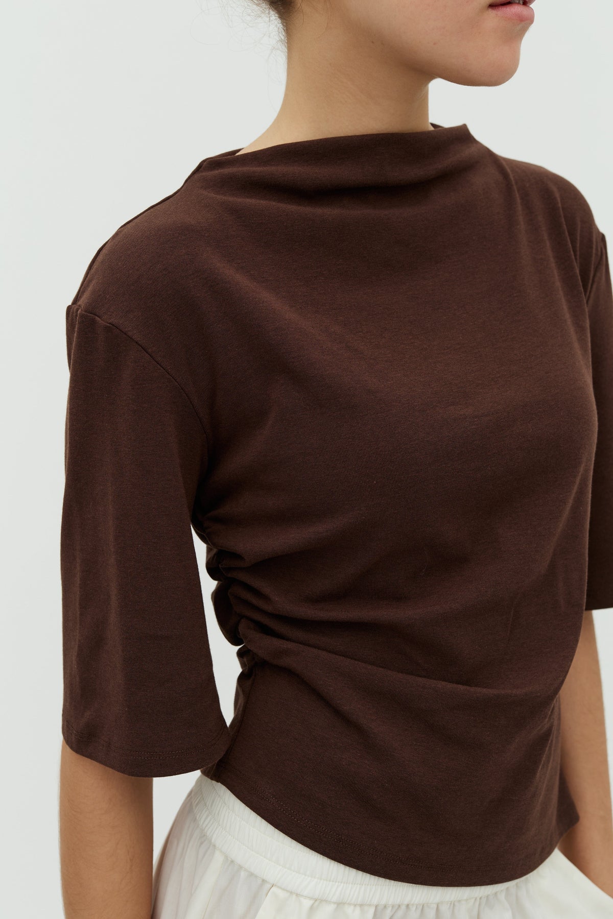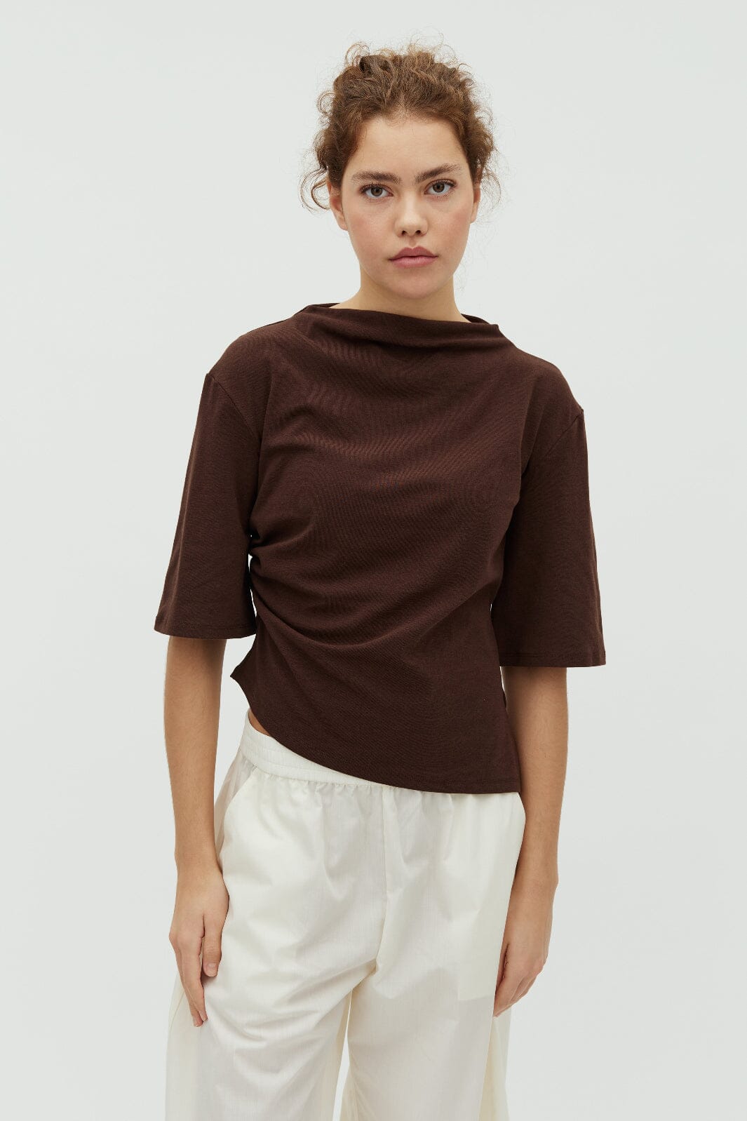 Bruine blouse van MbyM met hoge hals en halflange mouwen. De blouse heeft een asymmetrische zoom en een subtiel geplooid detail aan de zijkant.