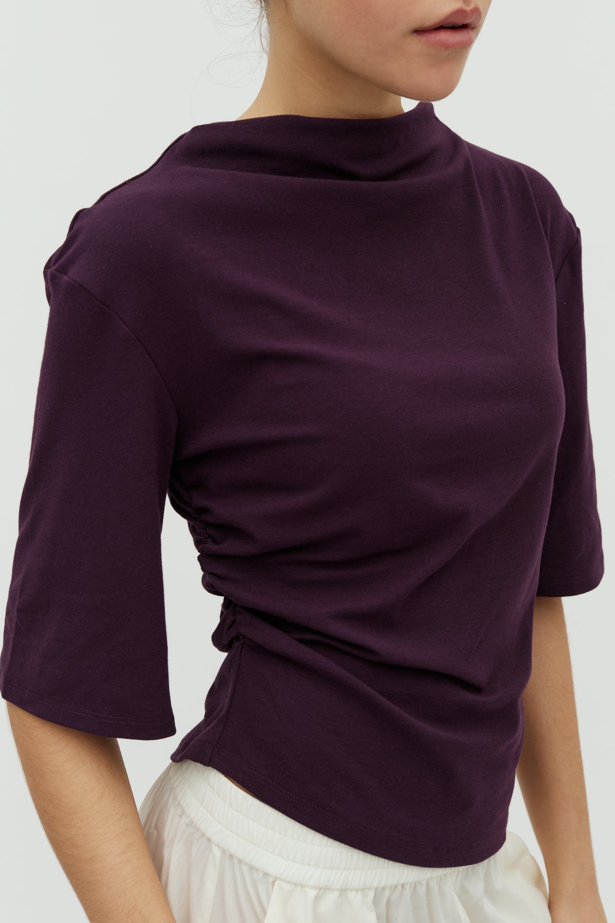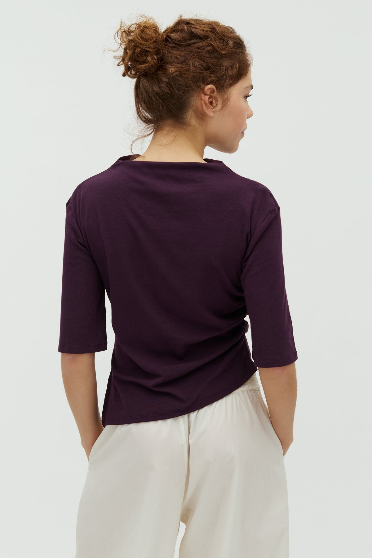 Paarse blouse van MbyM met driekwartlange mouwen en asymmetrische zoom. De blouse heeft een lichte rimpeling aan de zijkant.