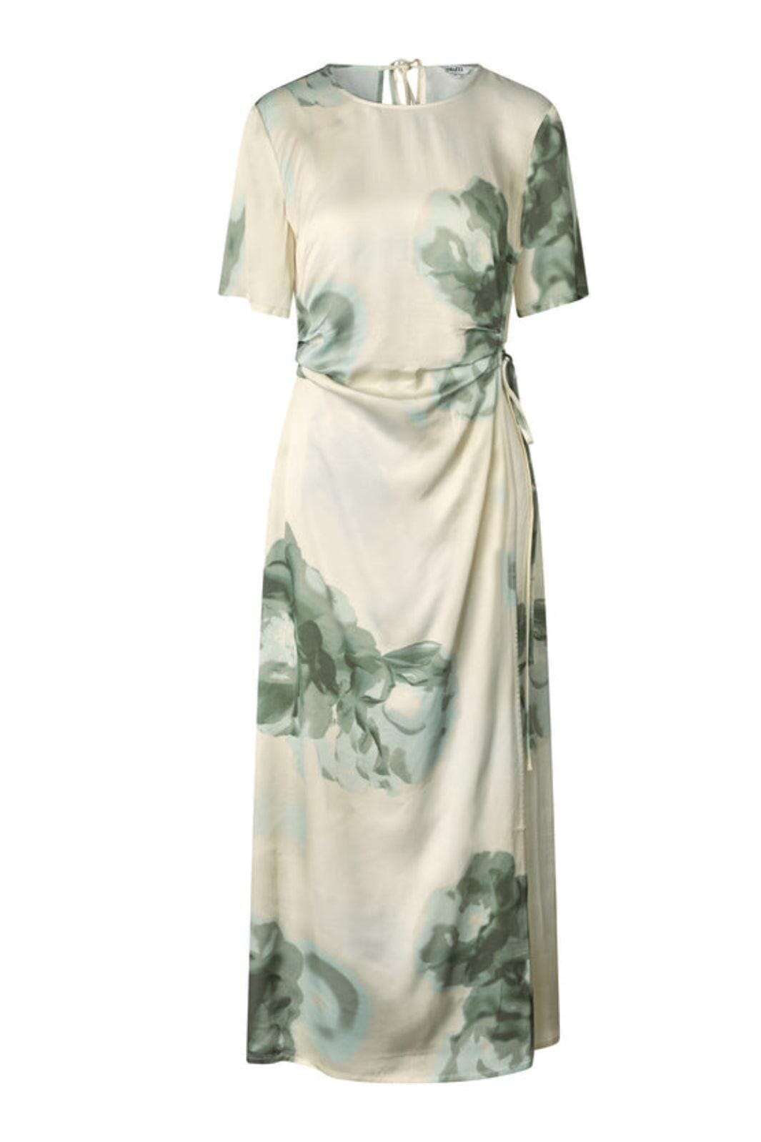 Jurk van MbyM, gemaakt van 100% viscose met een bloemenpatroon in tinten cream, wit en groen.