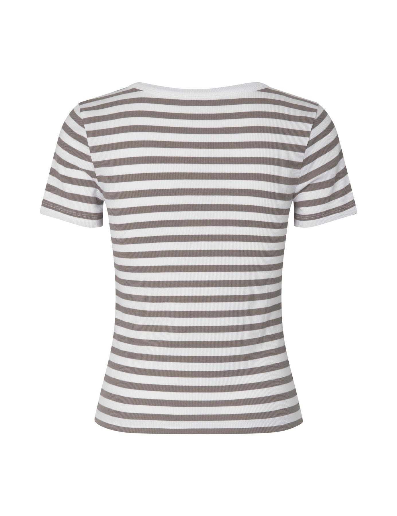 Gestreept T-shirt van MbyM met afwisselende strepen in wit en cinder. Het T-shirt heeft een ronde halslijn en korte mouwen.