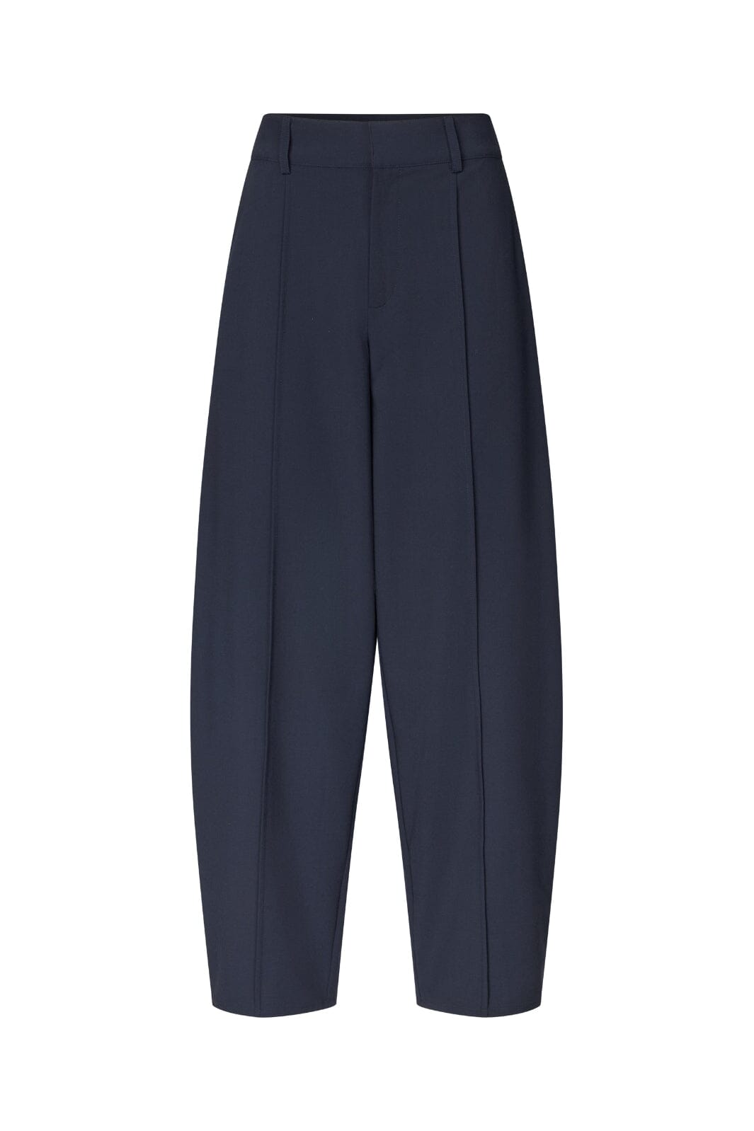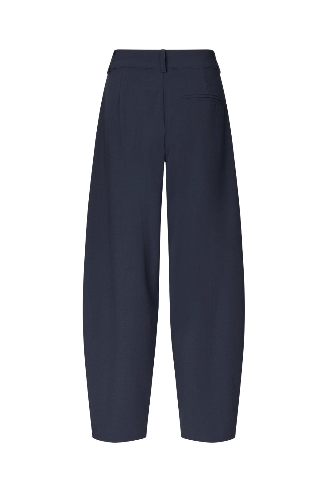 Donkerblauwe broek van MbyM met een hoog getailleerd ontwerp en wijde pijpen. De broek heeft een losse pasvorm en valt tot halverwege de kuit.