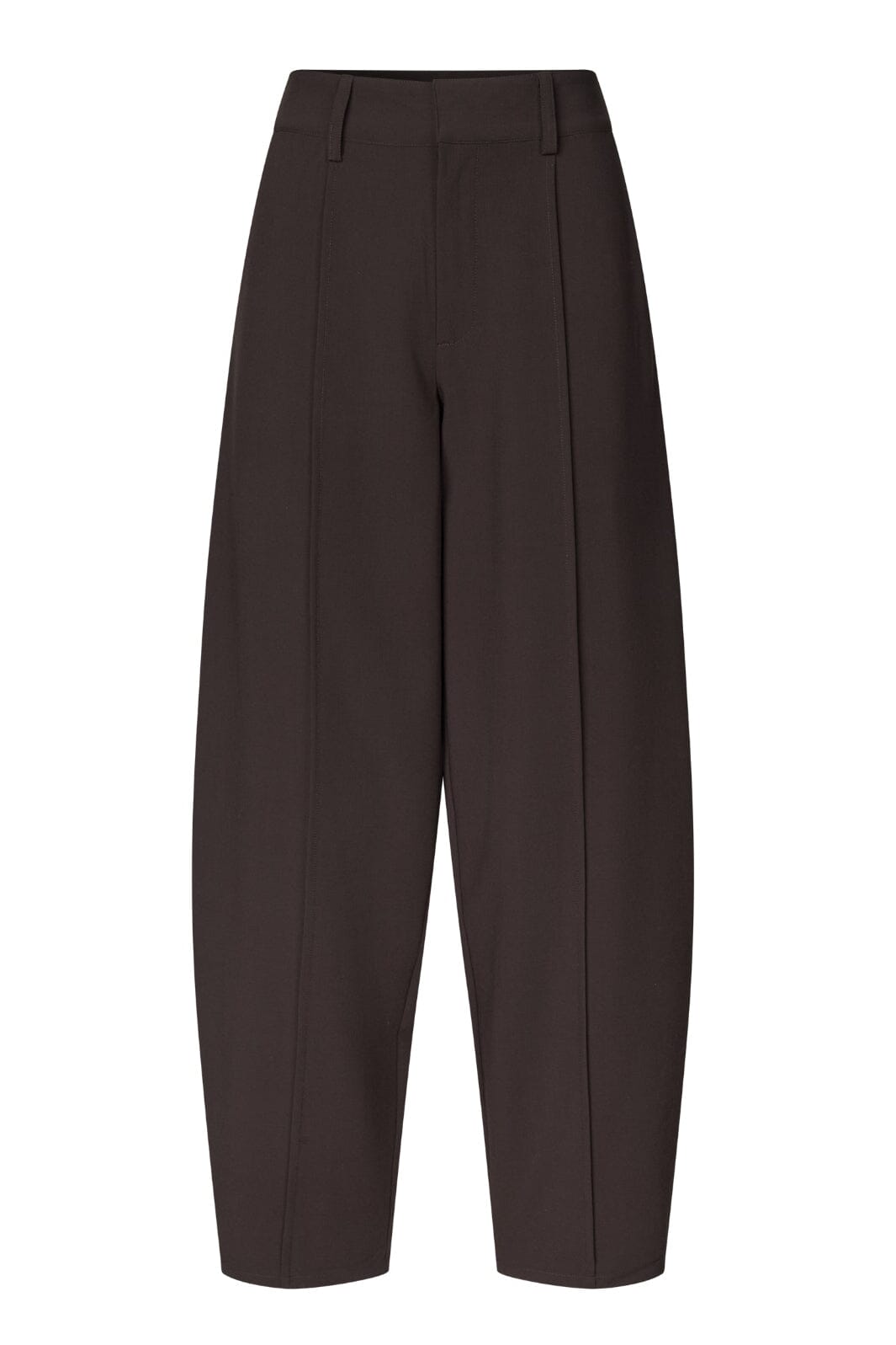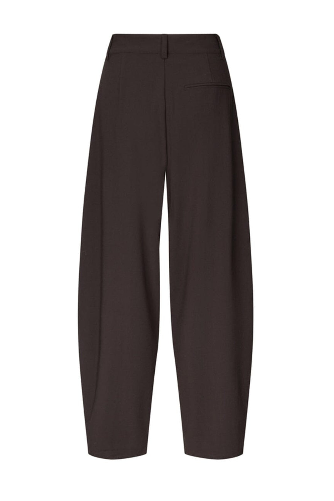 Donkerbruine broek van MbyM met een hoge taille en wijde pijpen. De broek heeft een losse pasvorm en valt tot aan de enkels.