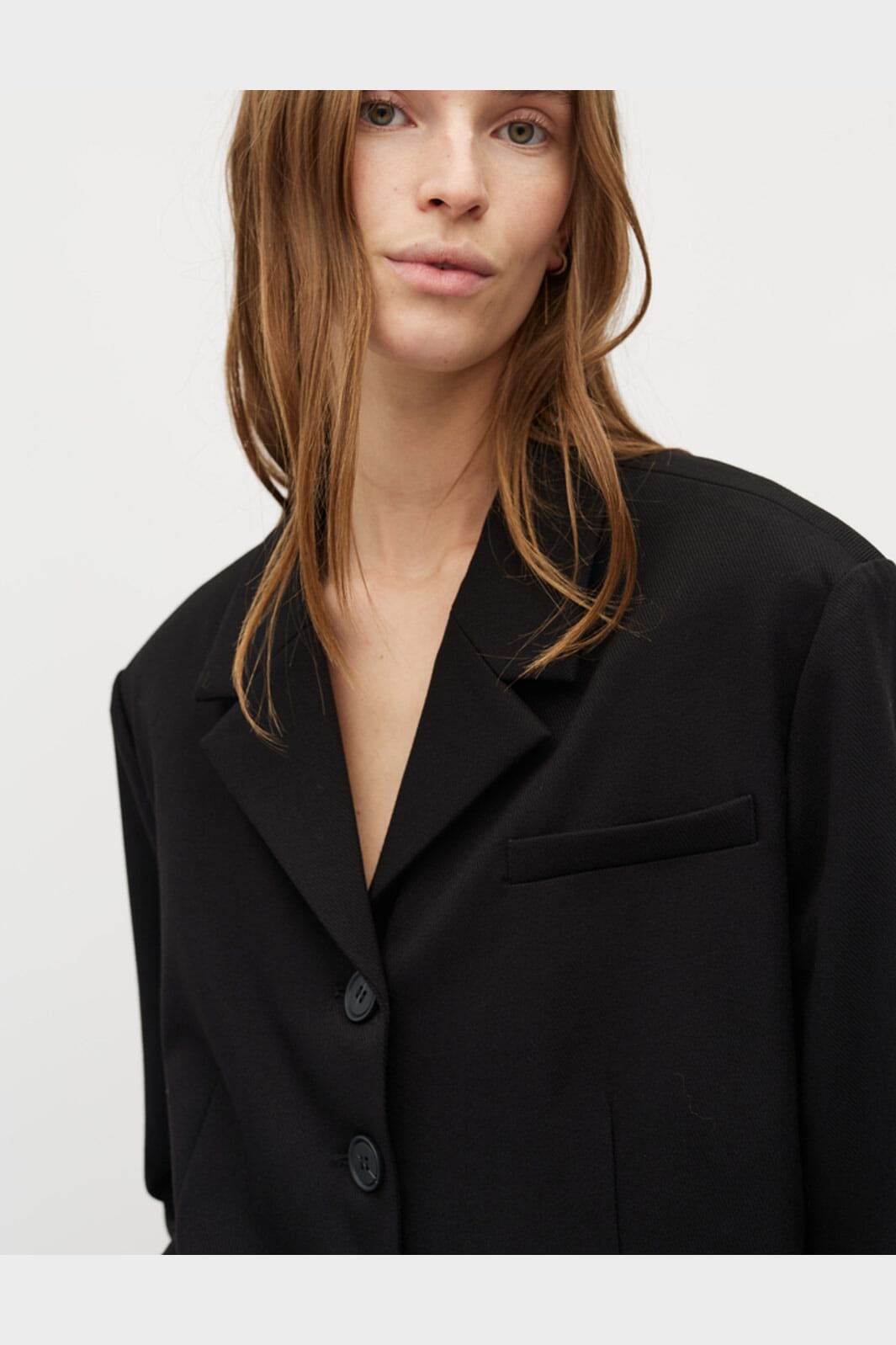 Zwarte blazer van MbyM met klassiek ontwerp. De blazer heeft vier knopen aan de voorkant, twee zakken en een traditionele kraag met revers.