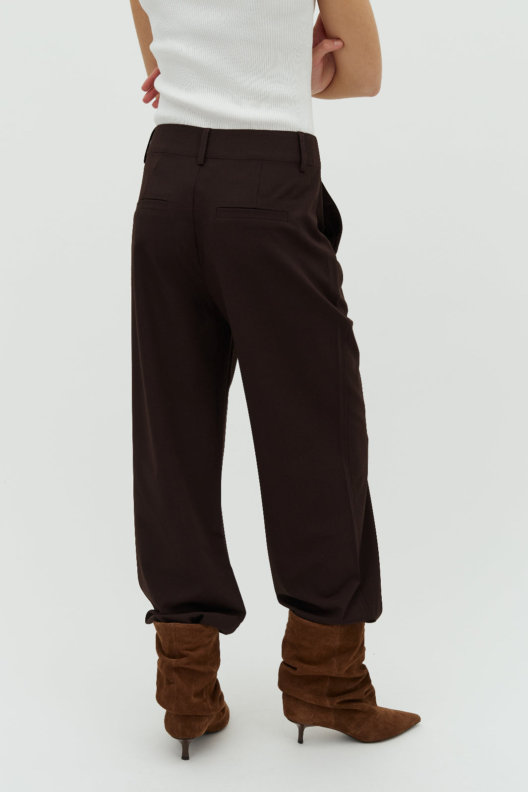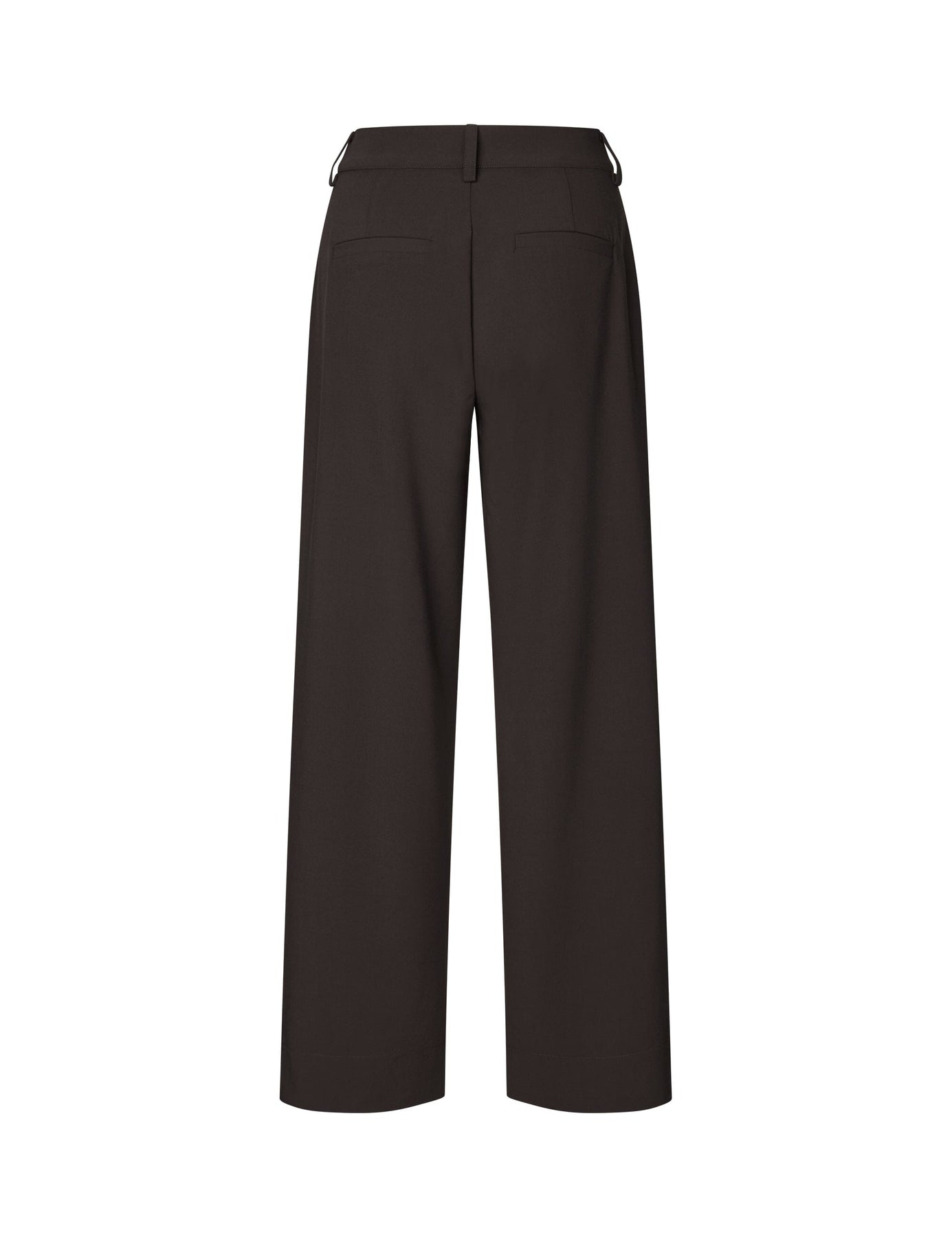 Donkerbruine broek van MbyM met rechte pijpen, riemlussen en steekzakken. De broek heeft een losse pasvorm en een lengte tot aan de vloer.