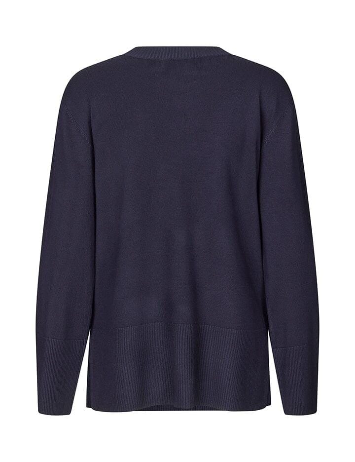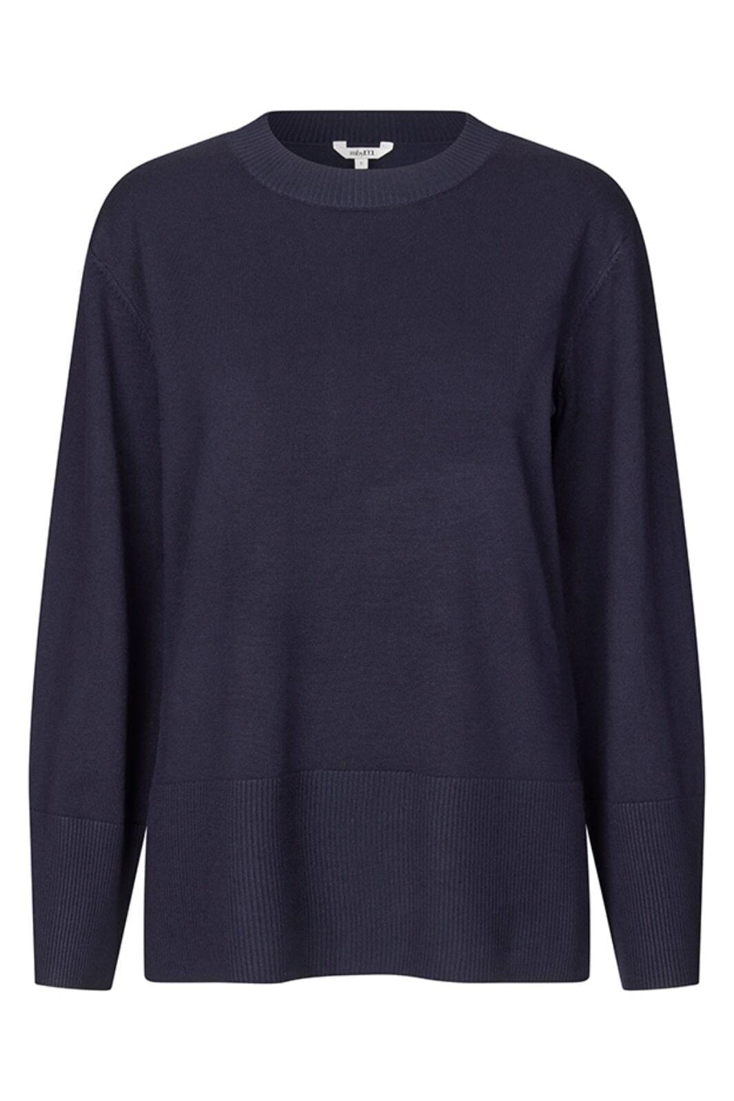Gebreide trui van MbyM in een donkerblauwe Night Sky-kleur. Het heeft een ronde hals en lange mouwen met ribbing aan de onderkant, wat zorgt voor een goede pasvorm.