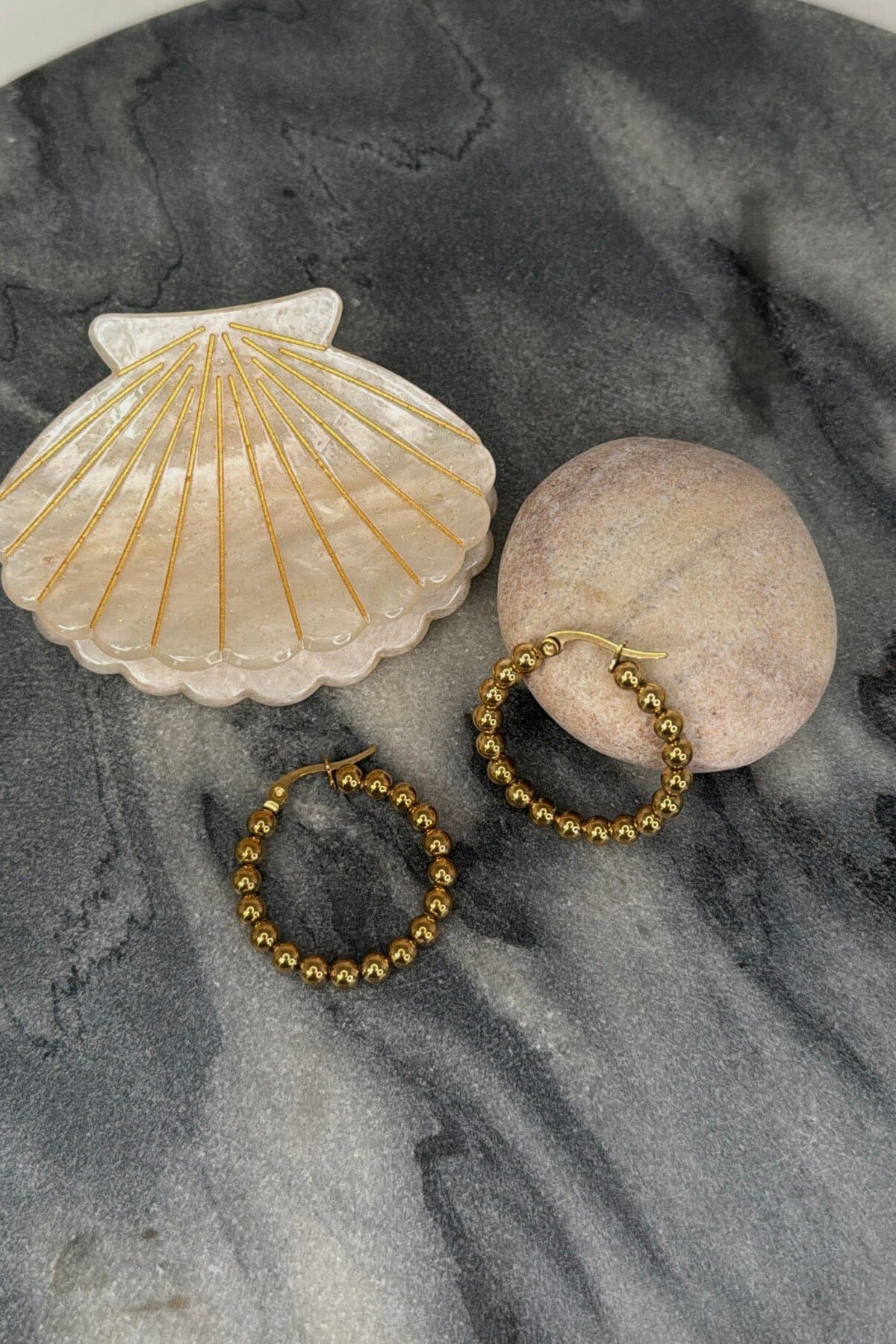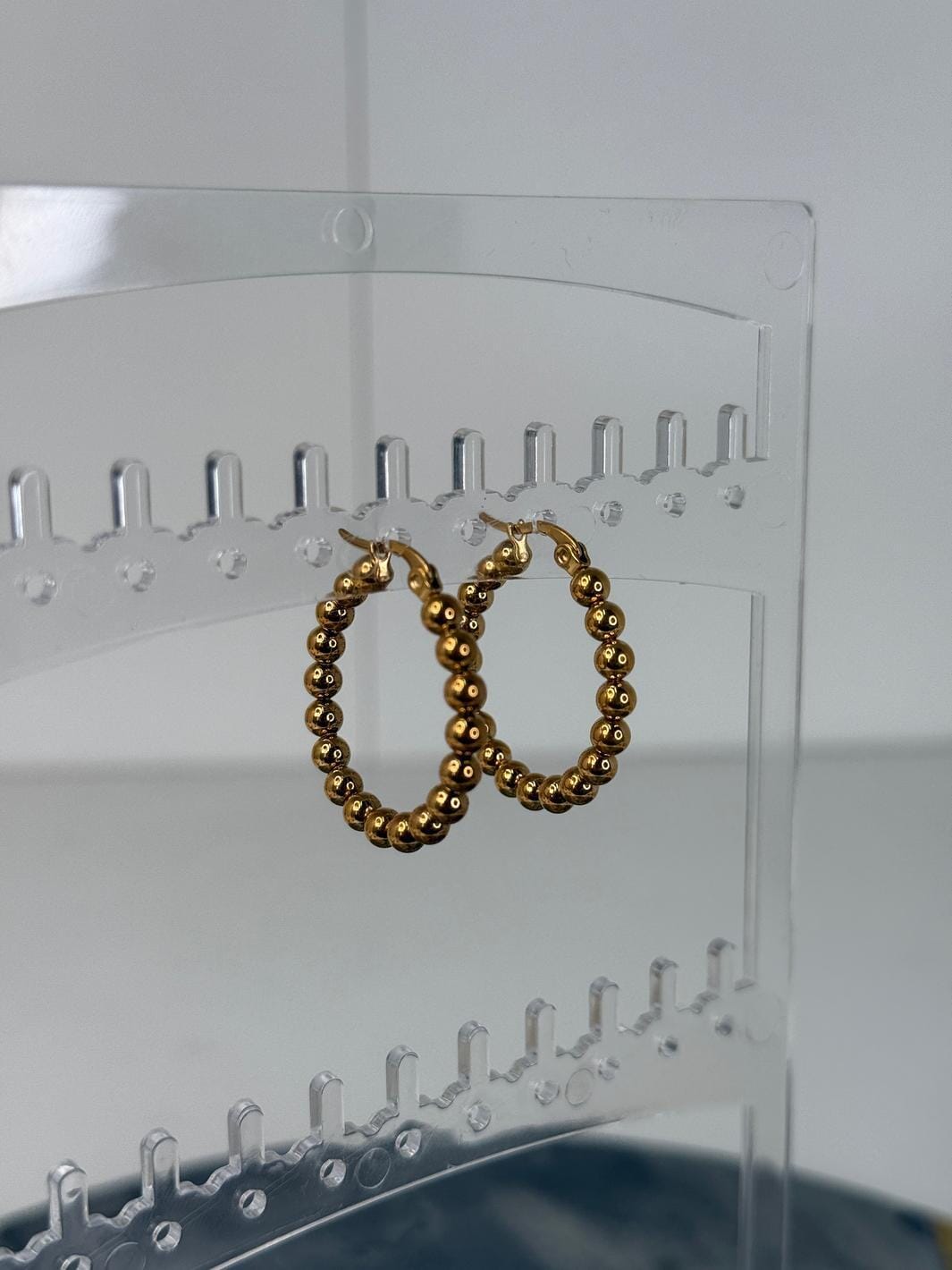Vergulde oorbellen van Mellow Moon met een ronde vorm. De oorbellen hebben kleine bolletjes langs de rand die een ronde formatie in vergulde afwerking vormen.