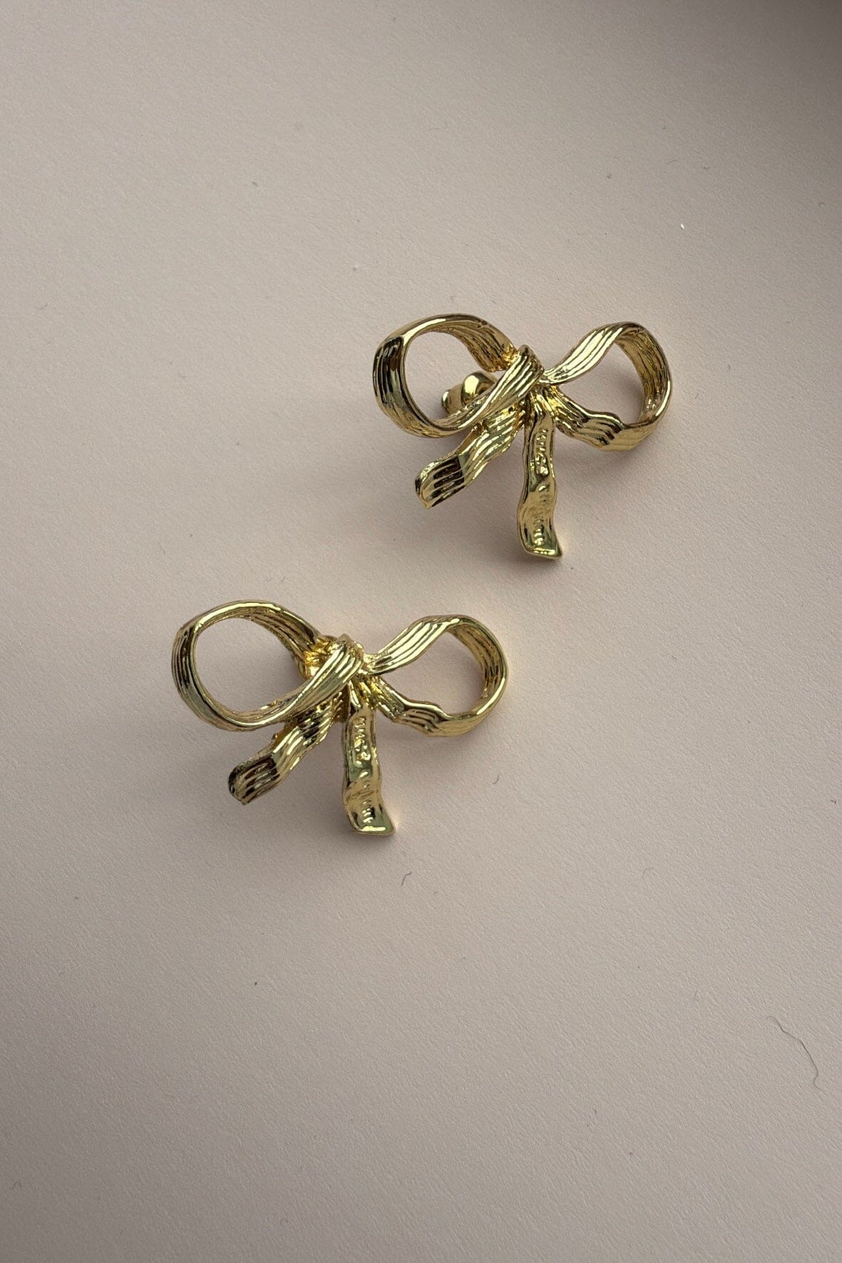 Strikvormige oorbellen van Mellow Moon met een gouden afwerking. De kleine strikken hebben een gedetailleerde textuur en een fijne vormgeving die zowel voor dagelijks gebruik als voor feesten kan worden gedragen.