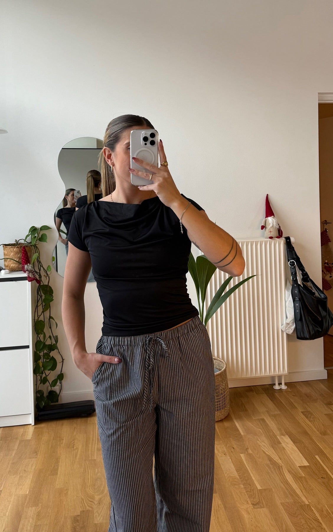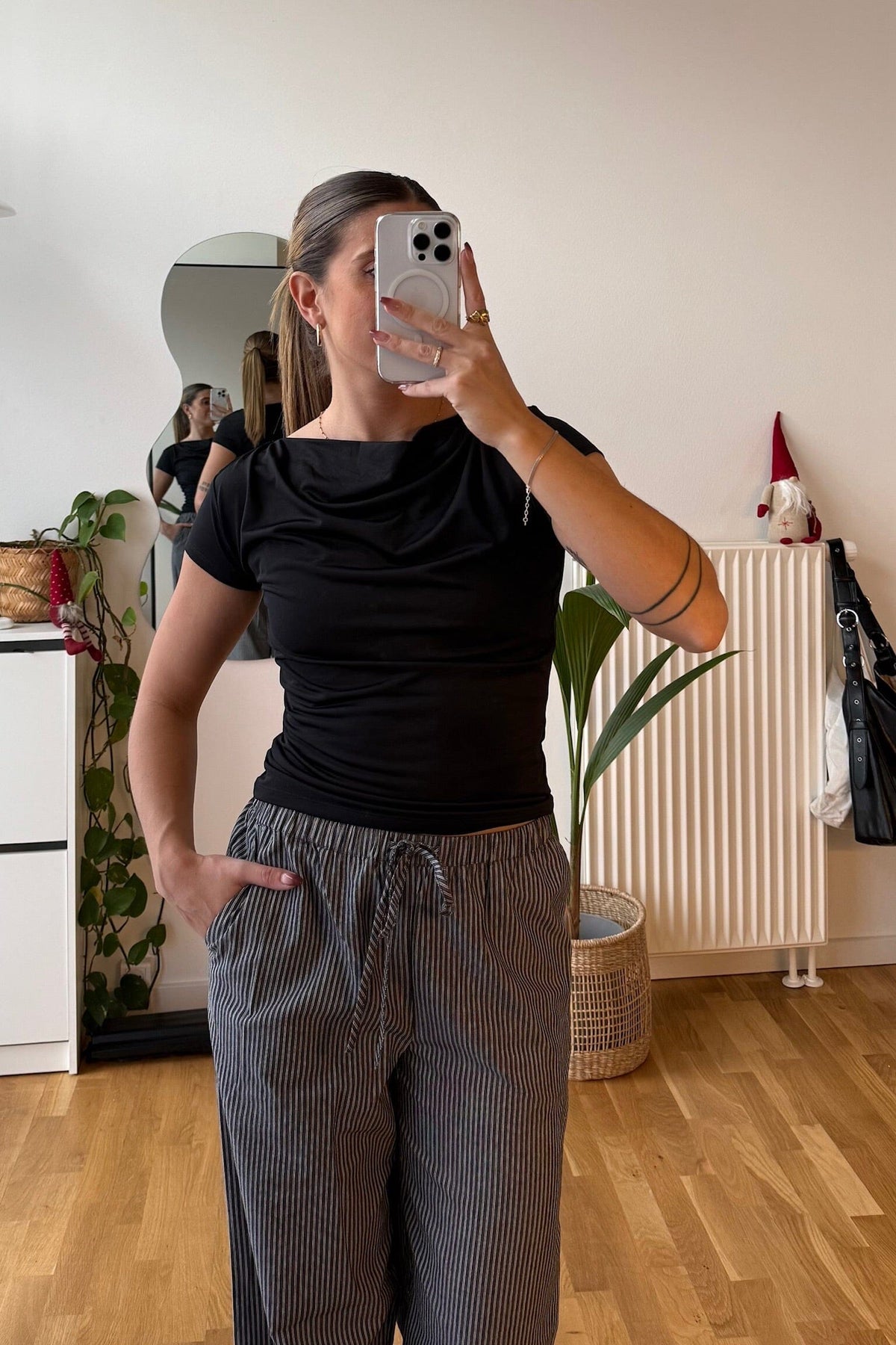 Zwart T-shirt van Modström met een gedrapeerde halslijn. Het T-shirt heeft korte mouwen en een aangesloten pasvorm.