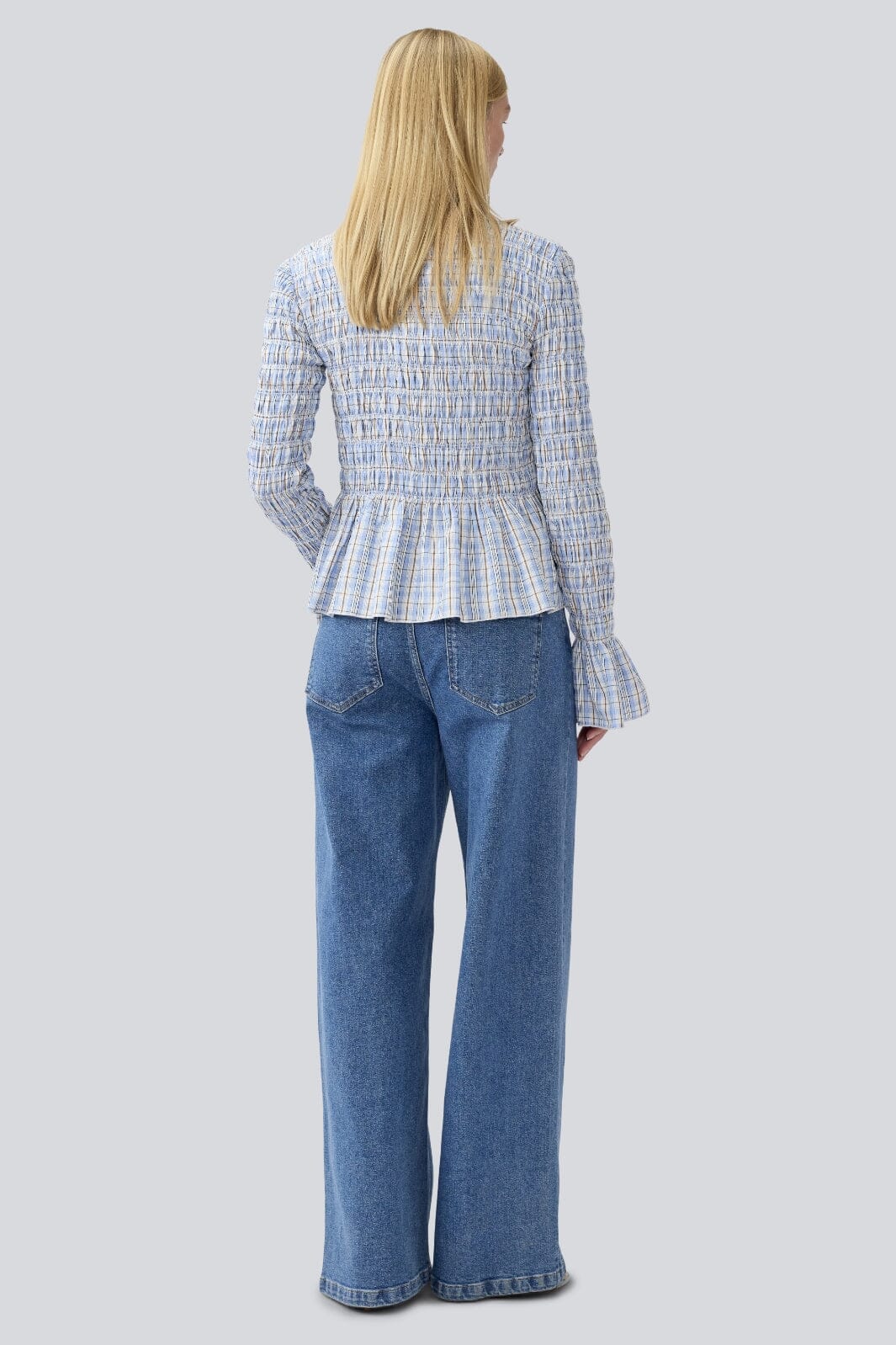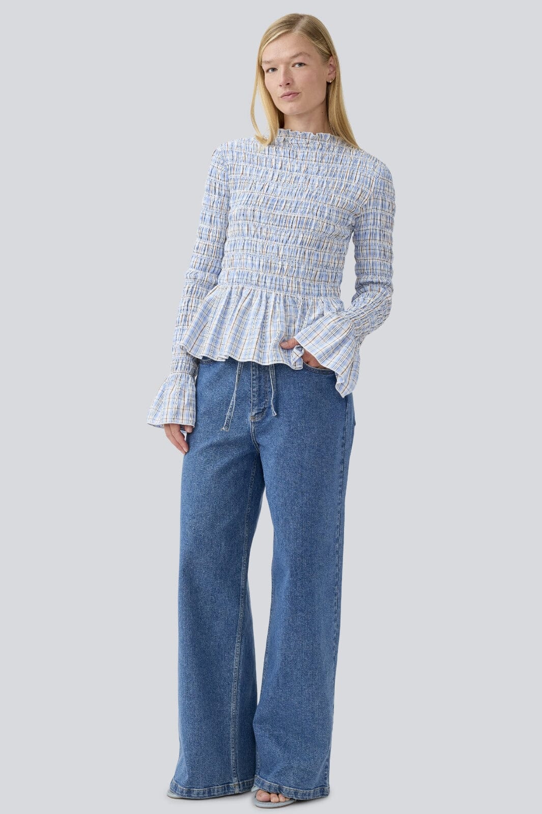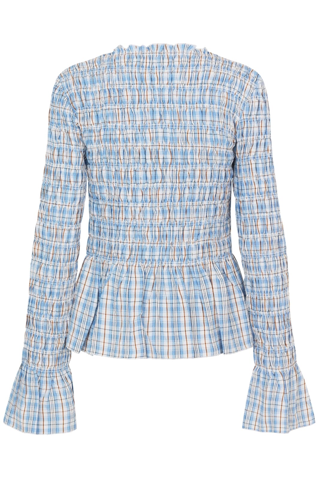 Geruite top van Modström met hoge hals en smock-details. De lange mouwen hebben een wijde vorm aan de onderkant, en de top heeft een geruit patroon in lichtblauw, blauw en witte tinten.