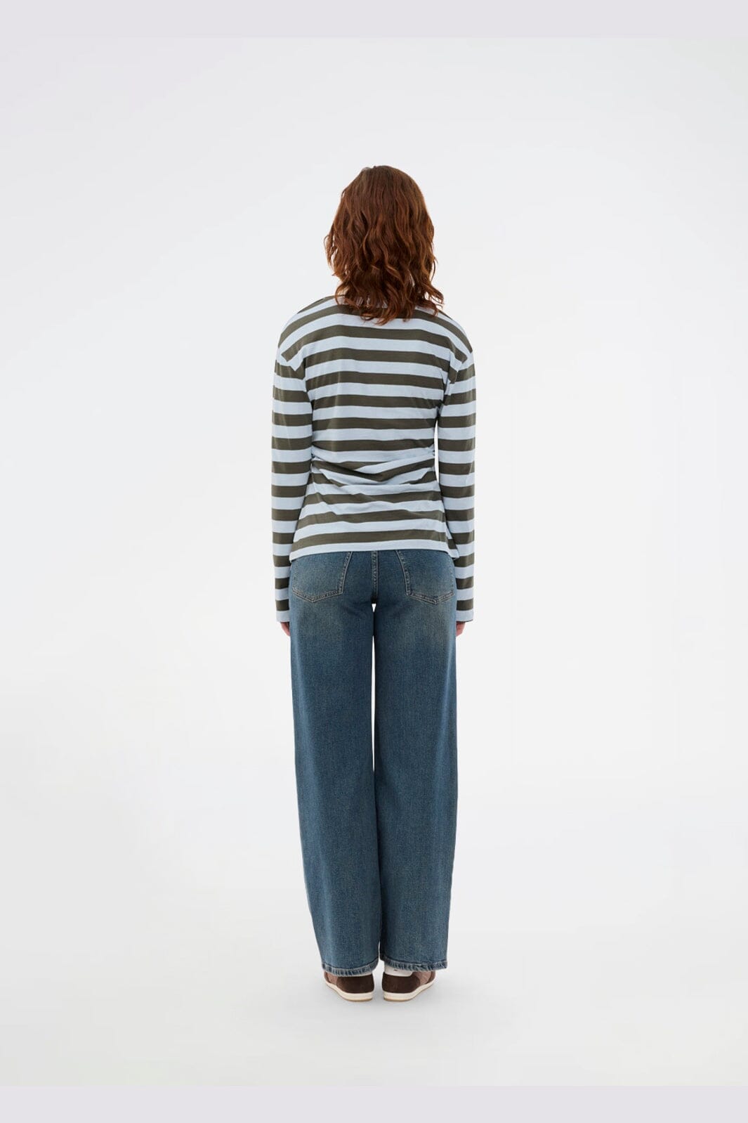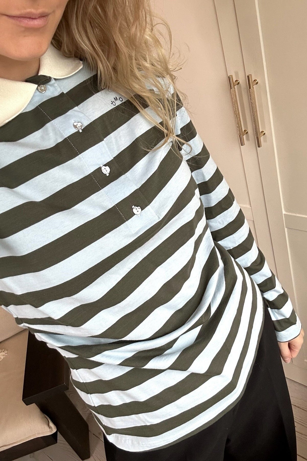 Lange mouwen polo van Modström in biologisch katoen. Ontworpen met horizontale strepen in lichtblauwe en donkergroene tinten, evenals een witte polokraag met knoopsluiting.