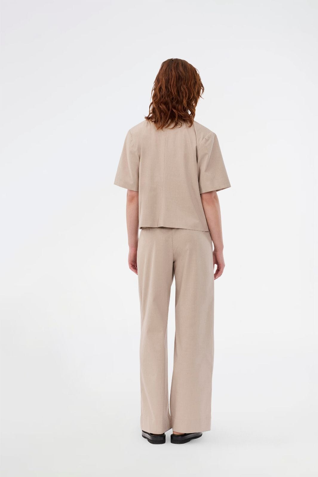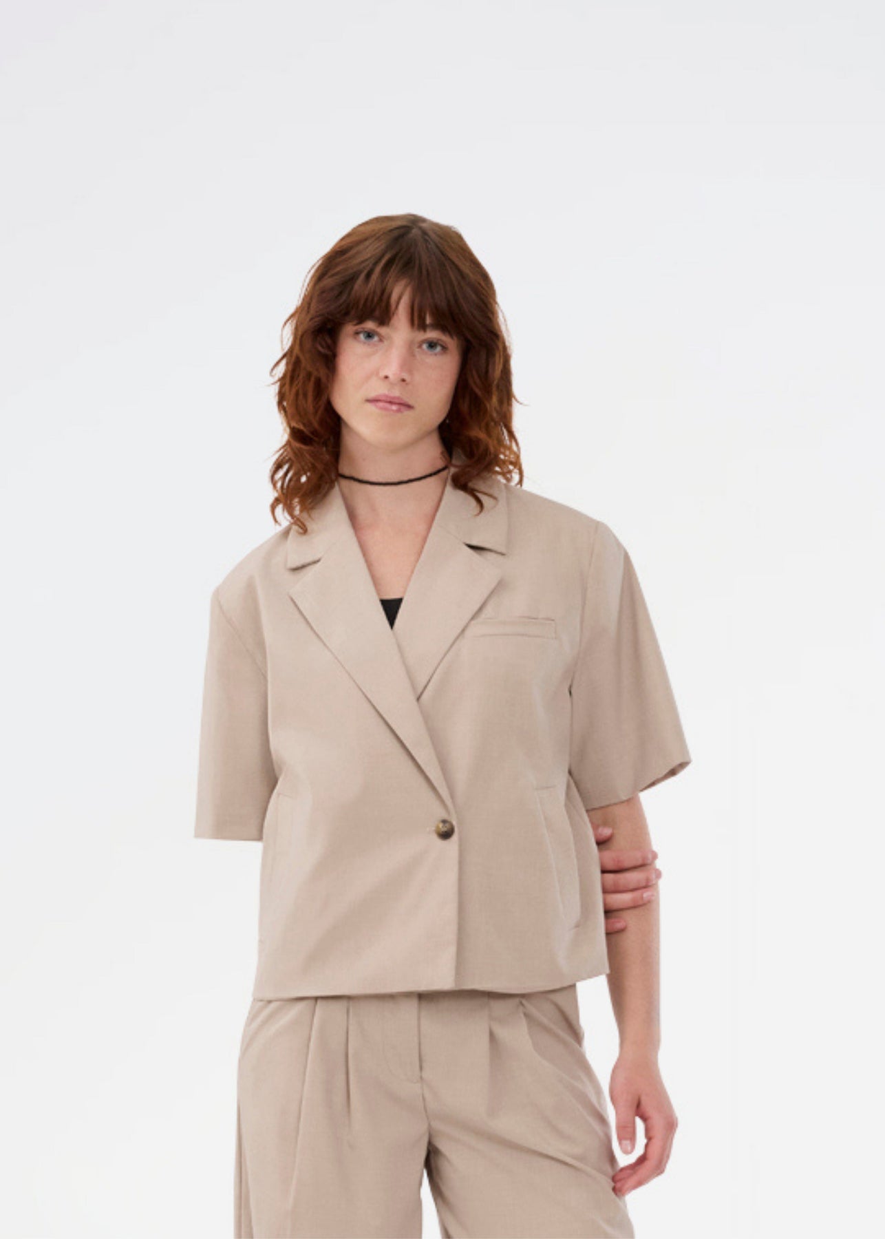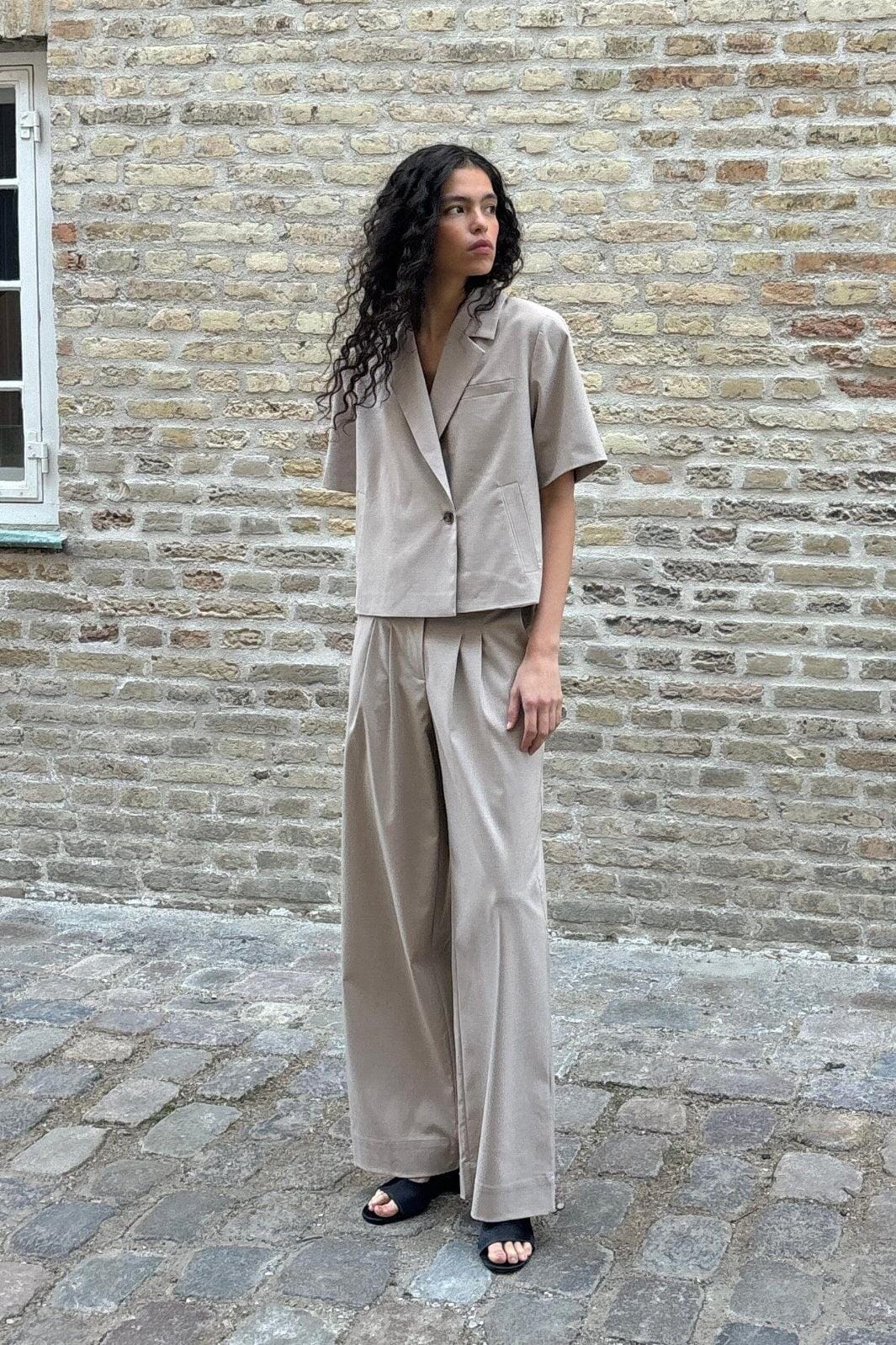 Kortmouwse blazer van Modström in beige met een gemêleerde structuur. De blazer heeft een overhemdkraag, een knoopsluiting en een losse pasvorm.