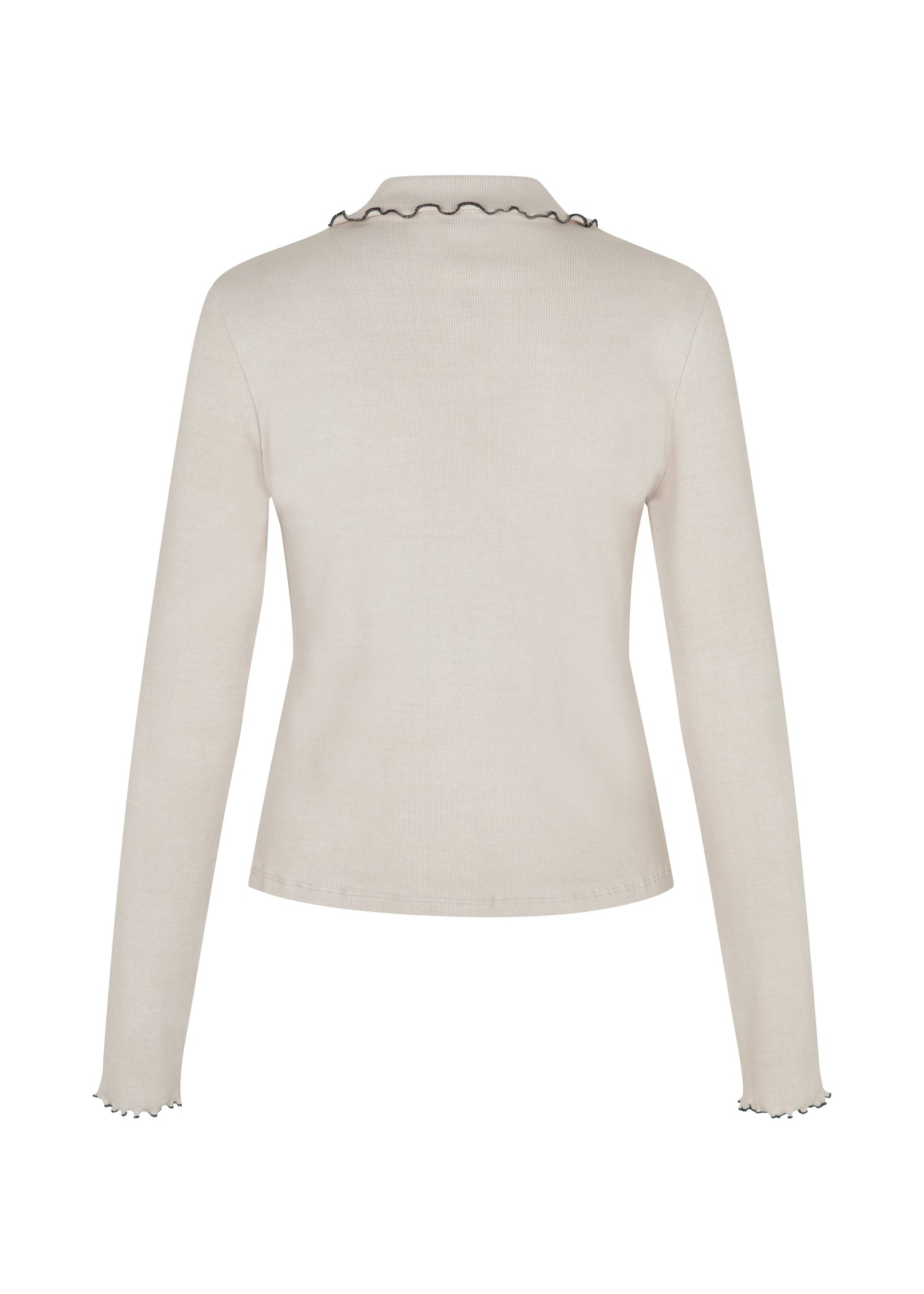 Een top van Modström in een licht beige tint. De top heeft een Peter Pan-kraag met een golvende rand in contrastkleur en een knoopsluiting aan de voorkant.