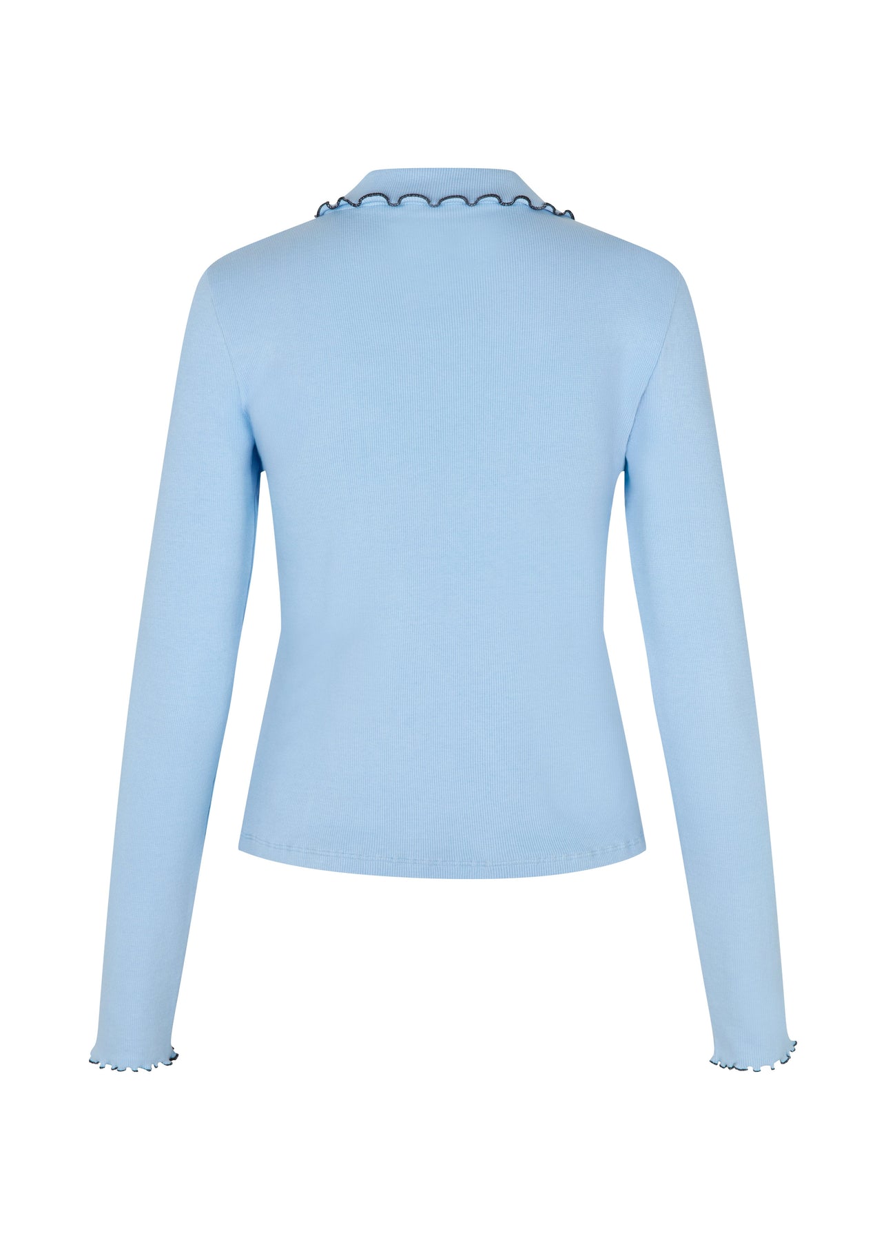 Lichtblauwe top met lange mouwen van Modström met polokraag en decoratieve ruches. De top heeft een slim fit-pasvorm en contrasterende stiksels langs de zoom.