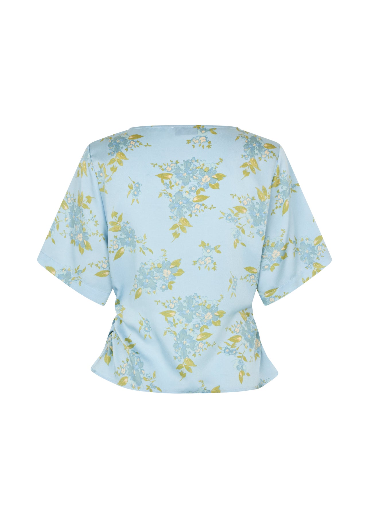 Top van Modström met een bloemenpatroon op een lichtblauwe achtergrond. De top heeft korte mouwen en een ronde halslijn.