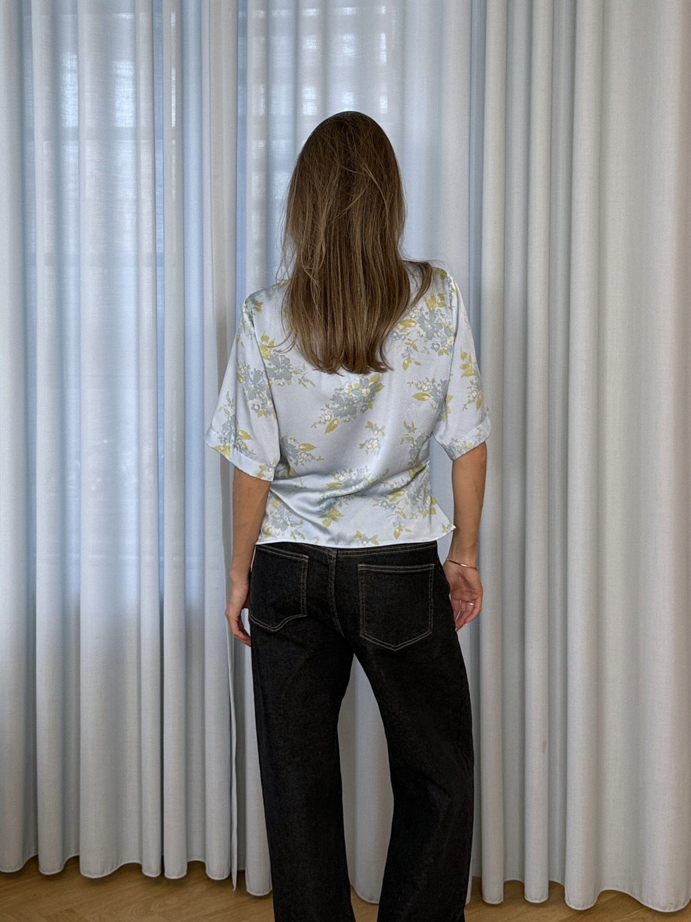 Top van Modström met een bloemenpatroon op een lichtblauwe achtergrond. De top heeft korte mouwen en een ronde halslijn.