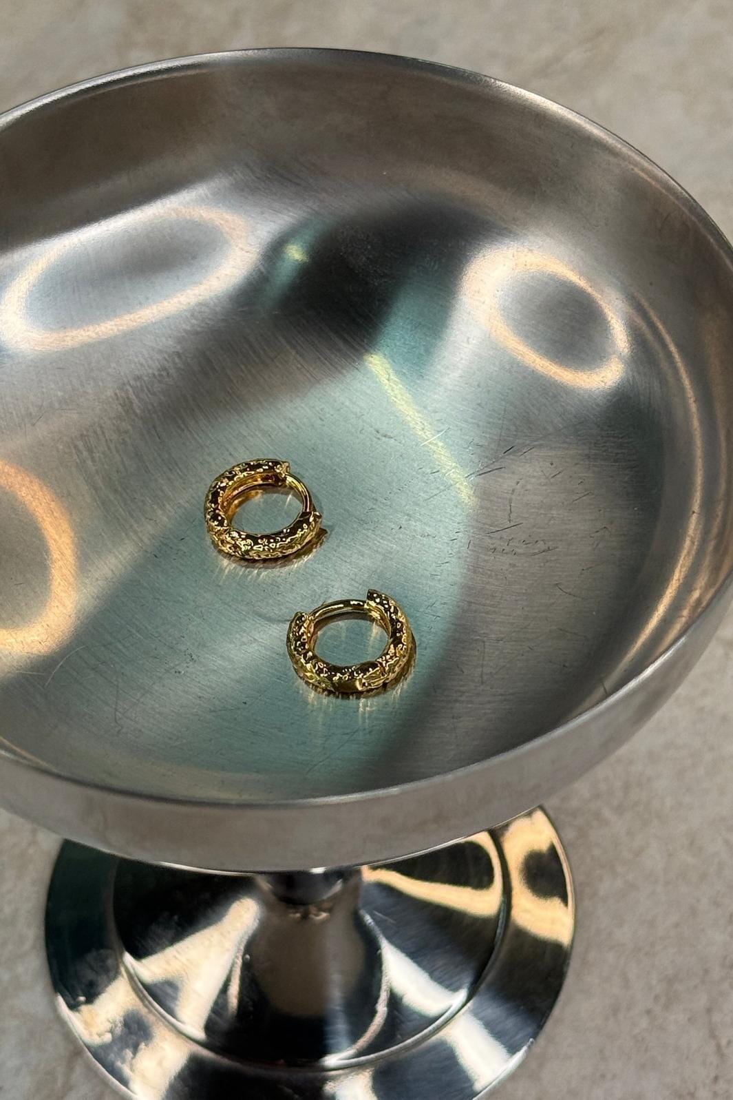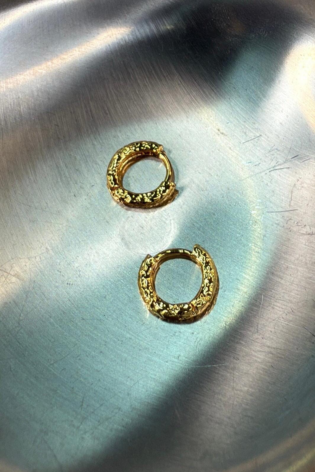 Gouden oorbellen van Molly&My Jewellery met een ronde vorm en een gedetailleerd oppervlak. De oorbellen zijn verguld en hebben een scharnier-sluiting.