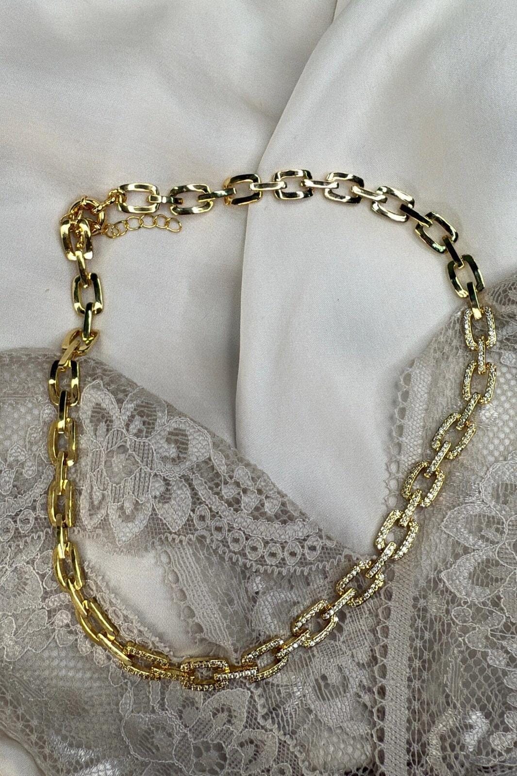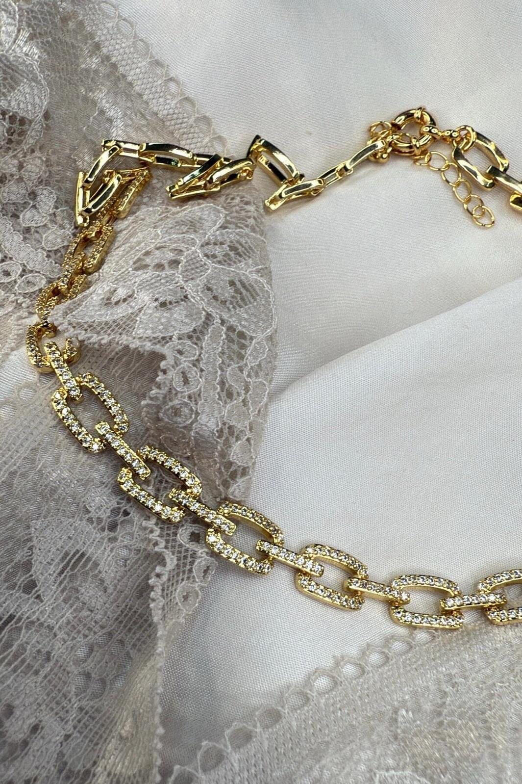 Vergulde ketting van Molly&My Jewellery met rechthoekige schakels. Sommige schakels zijn versierd met kleine, glanzende steentjes. De ketting heeft een verstelbare sluiting.