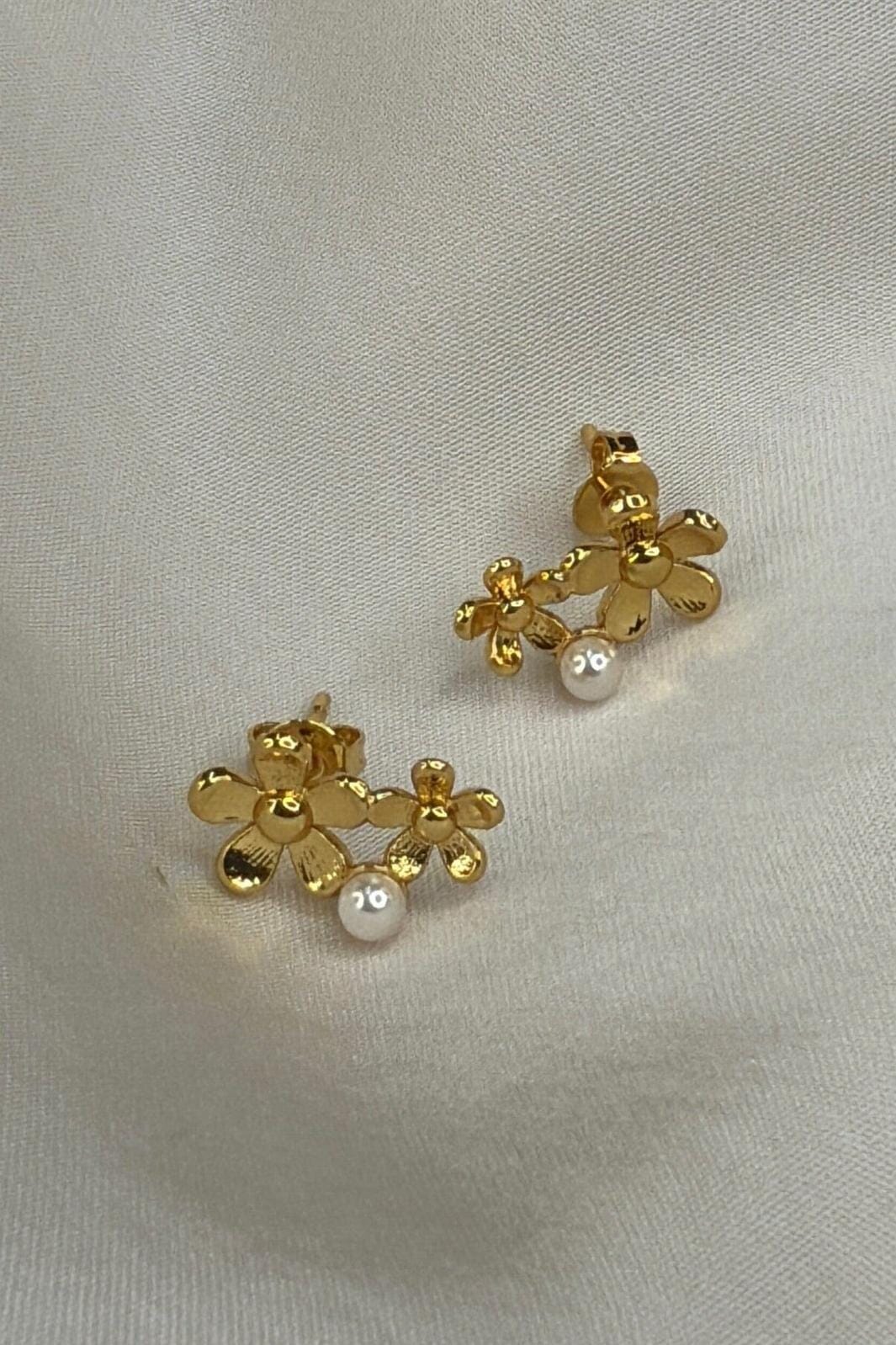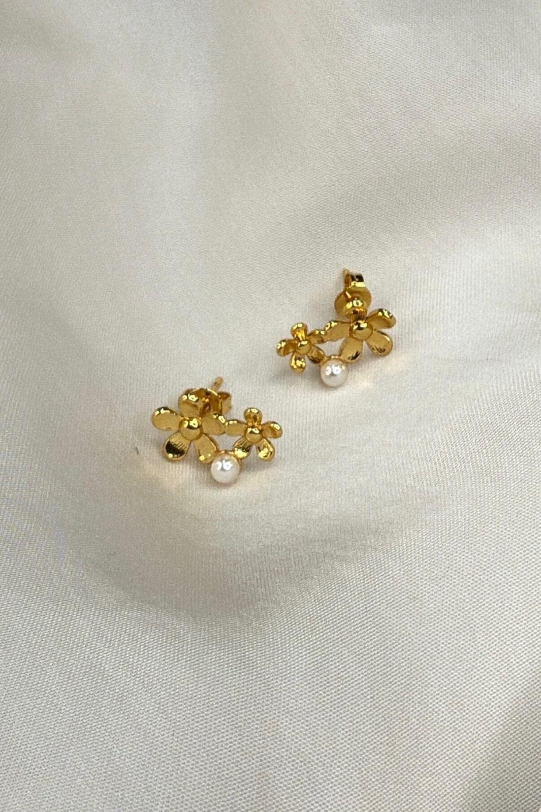Vergulde oorstekers van Molly&My Jewellery met twee kleine bloemen in goud en een witte parel aan elke oorsteker.