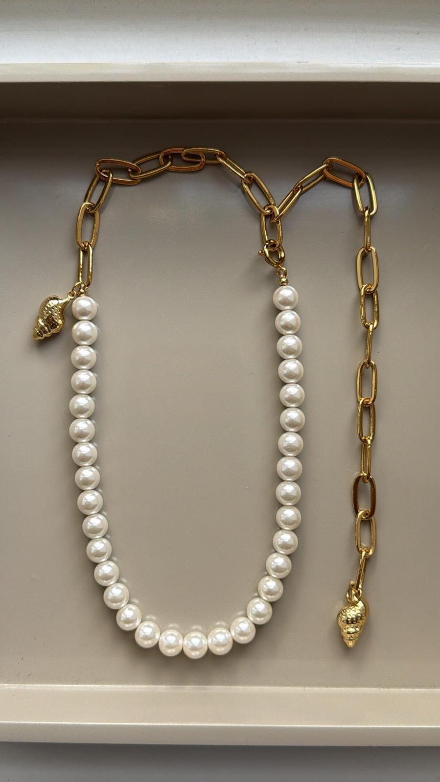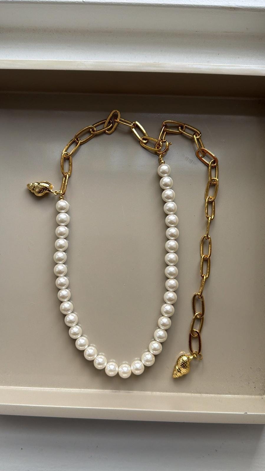 Vergulde ketting van Molly&My Jewellery. Het ontwerp combineert witte kralen met goudkleurige schakels in een half-om-half verdeling.