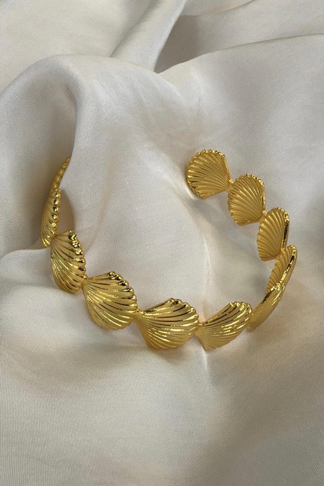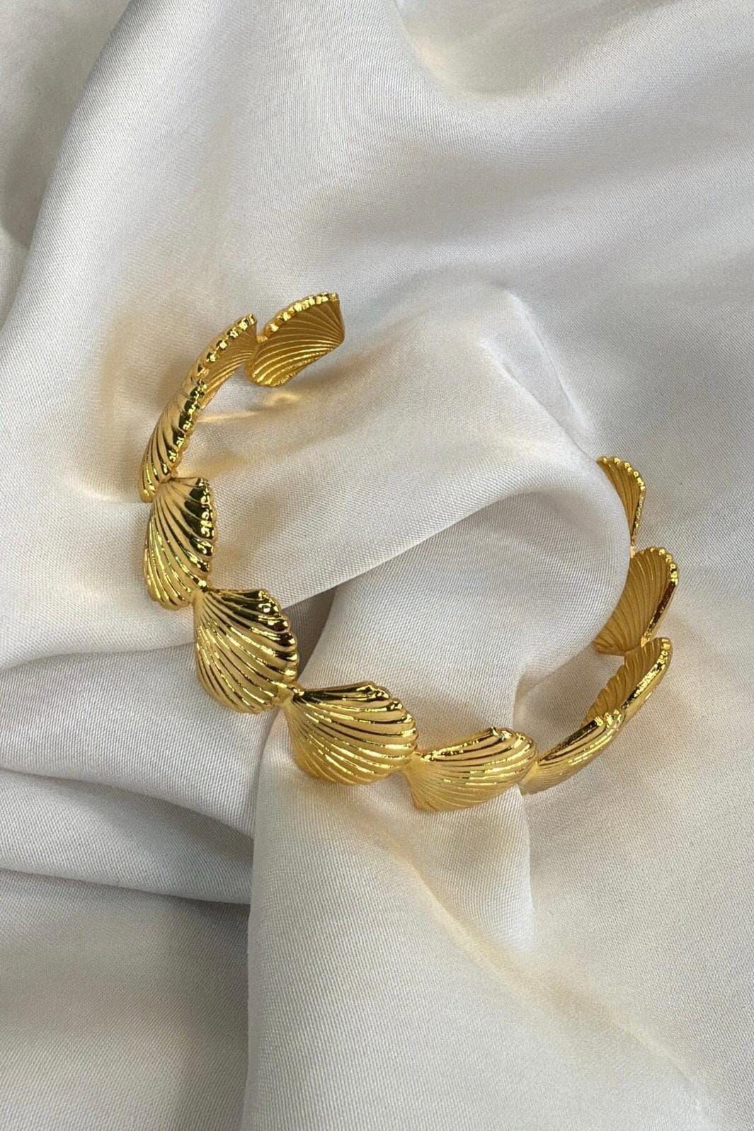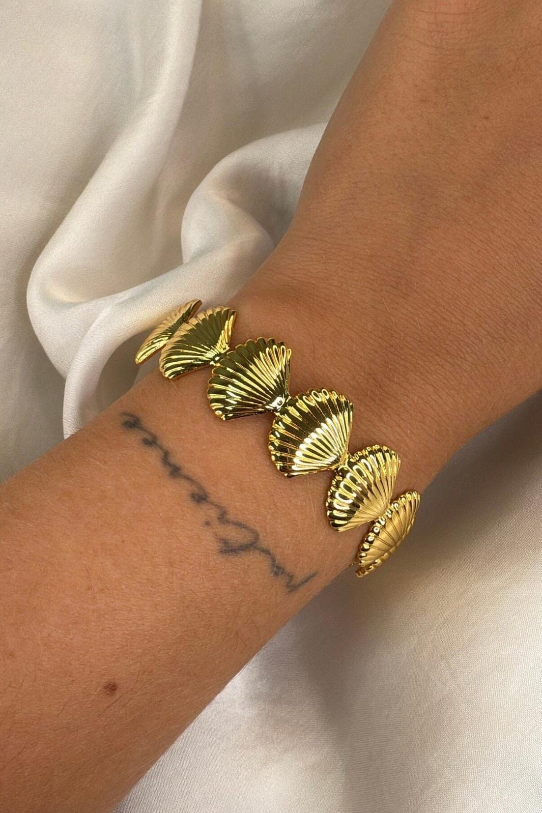 Verguld armband van Molly&My Jewellery met schelpvormige schakels. Het armband is gemaakt van messing en heeft een glanzende gouden kleur.