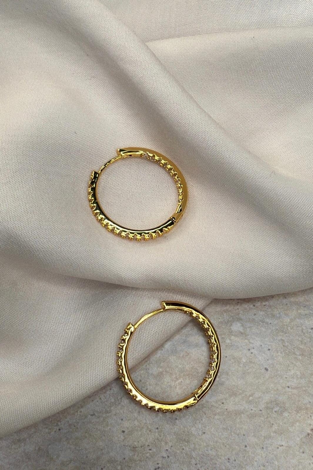 Vergulde hoops van Molly&My Jewellery. De oorbellen zijn gemaakt van messing met kleine heldere CZ-steentjes langs de buitenrand in een ronde vorm.
