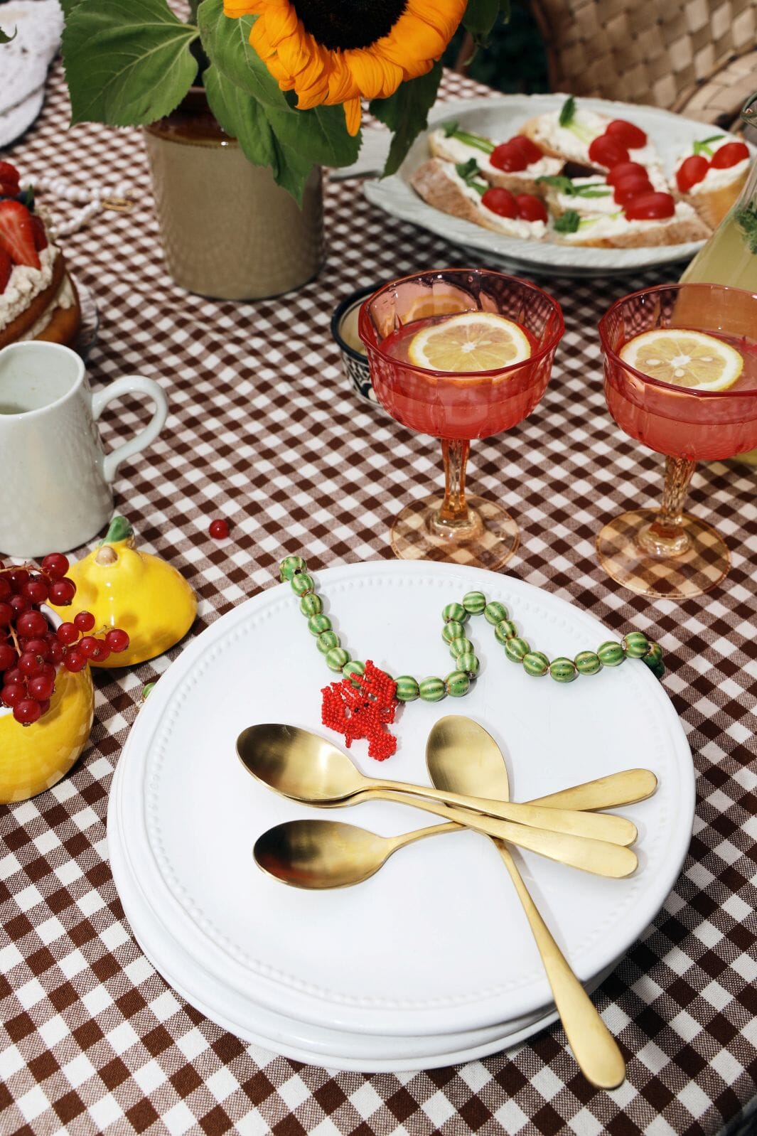 Een ketting van Molly&My Jewellery x Caroline Dan met groene porseleinen kralen en een rood hanger in de vorm van een kreeft van glas.