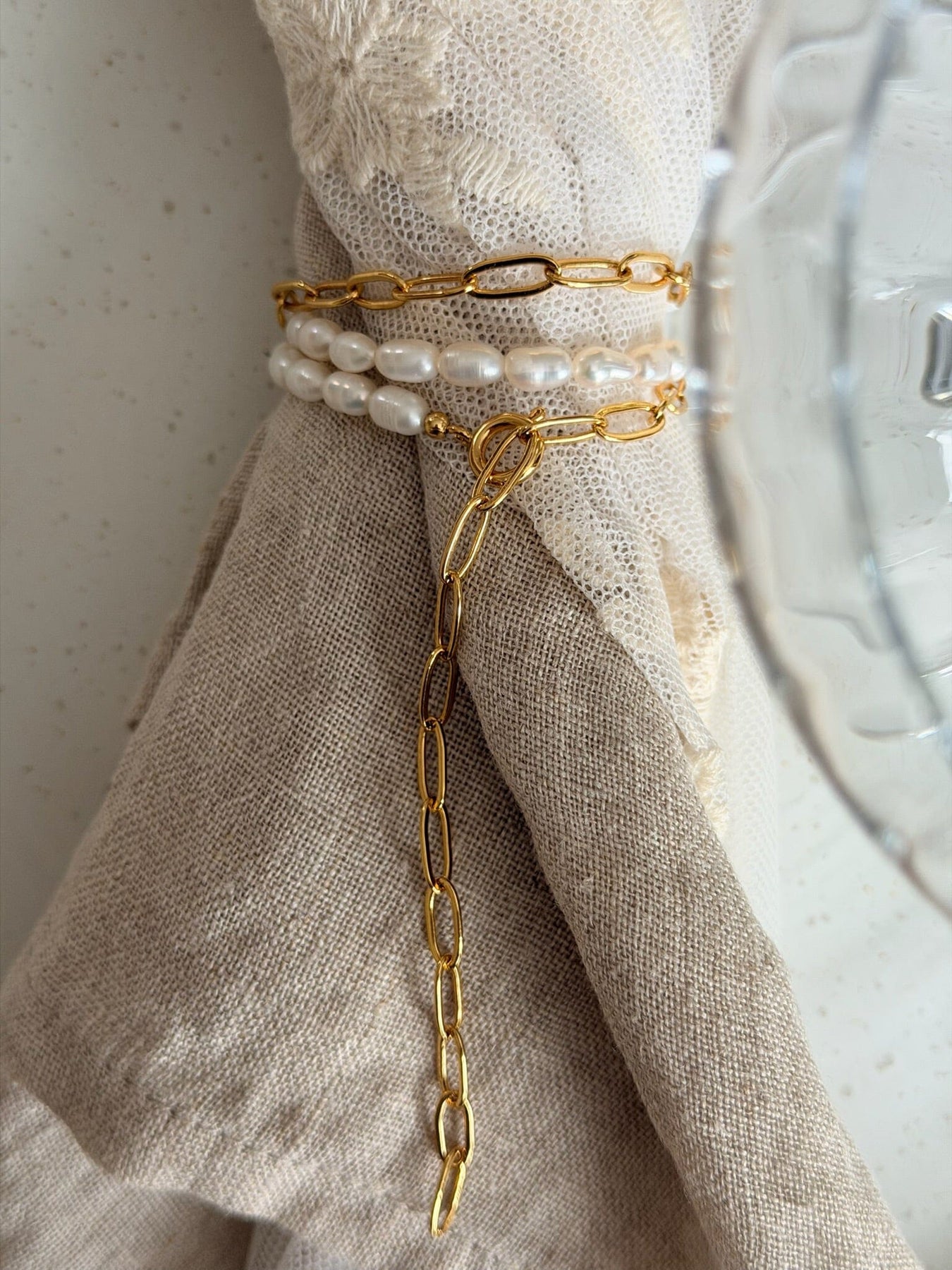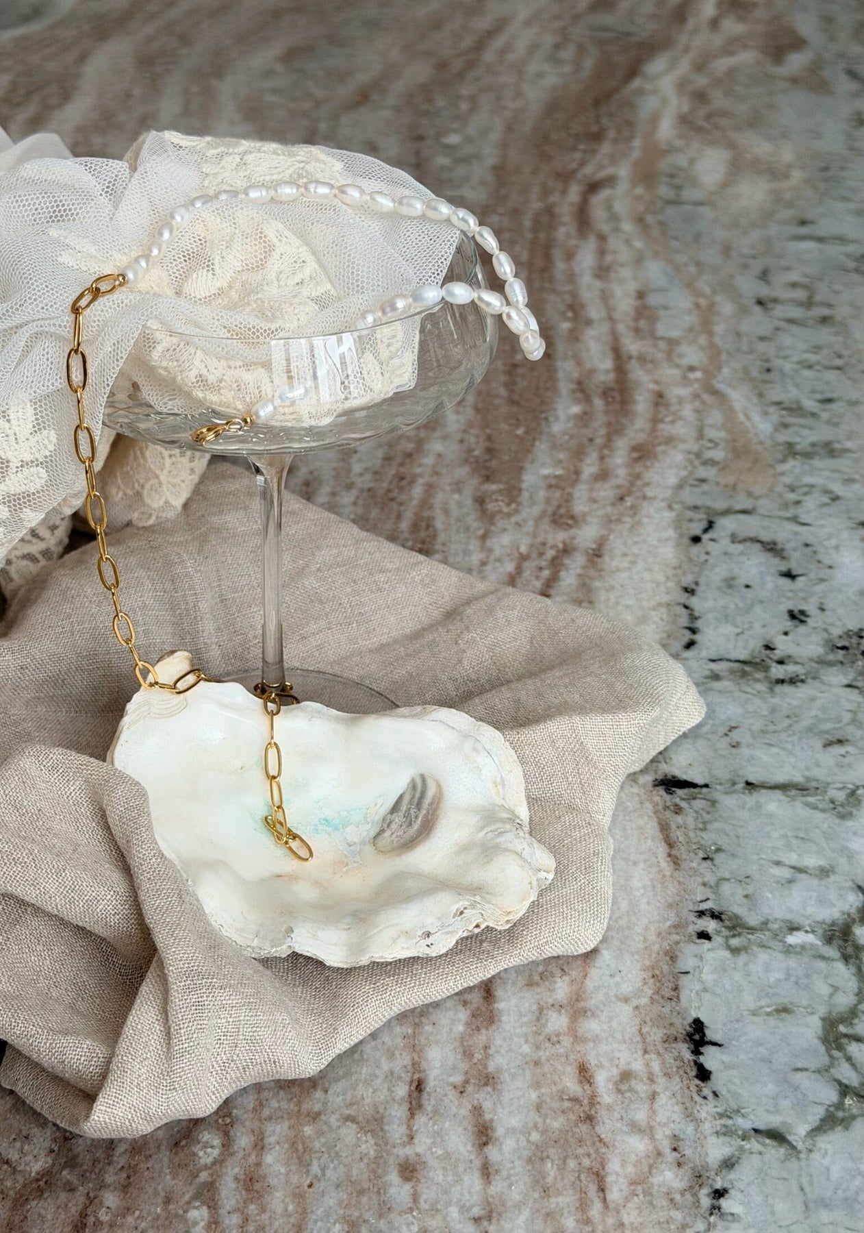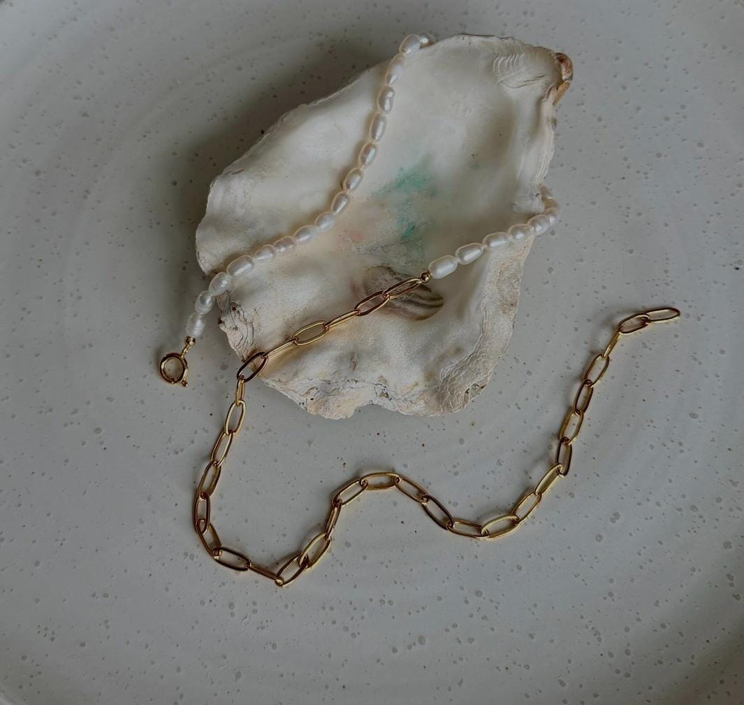 Ketting van Molly&My Jewellery x Melanie Due. Harmony combineert langwerpige paperclip-schakels van goudkleurig roestvrij staal met ovale schelp-parels in wit en crème.