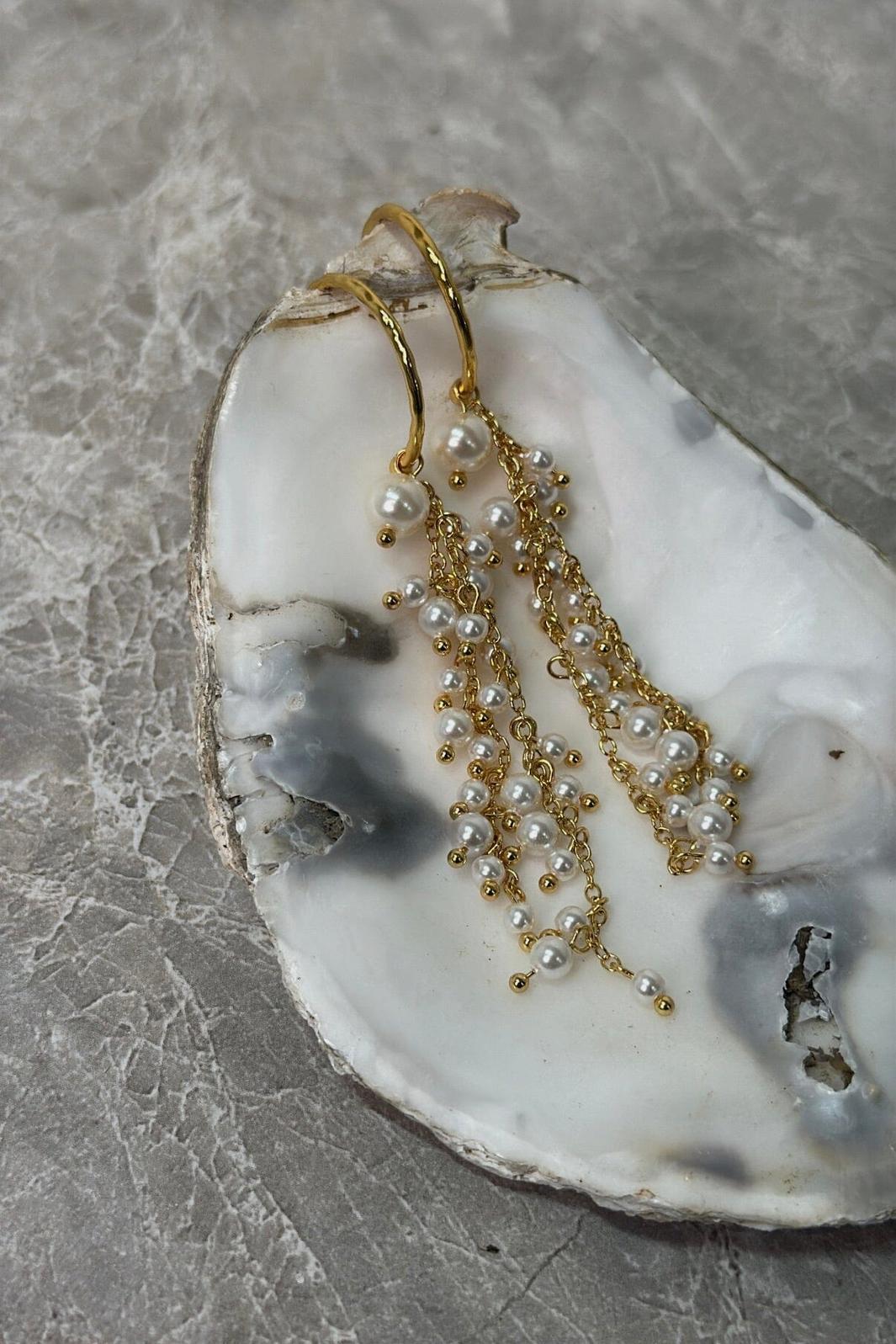 Vergulde oorbellen van Molly&My Jewellery x Melanie Due, gemaakt van roestvrij staal met hangers van kettinkjes en parels.