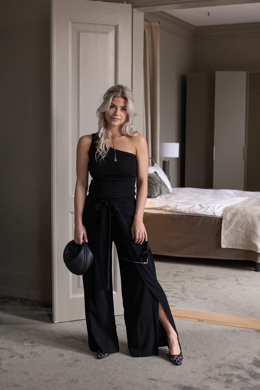 Zwarte broek van Molly & My X Melanie Due, gemaakt van 70% viscose en 30% linnen. Het materiaal is licht en ademend.