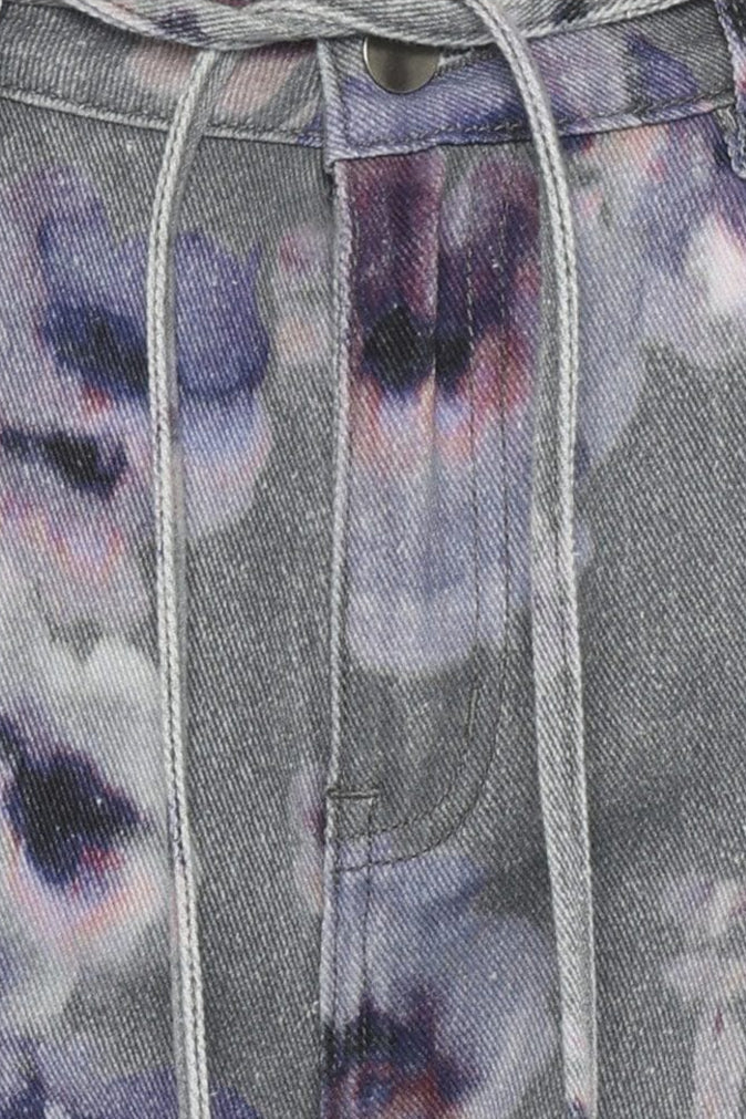 Jeans van Moves by Minimum met een bloemenpatroon in grijs en paars op een grijze achtergrond. De broek heeft een hoge taille met een strik en een losse pasvorm door de benen.