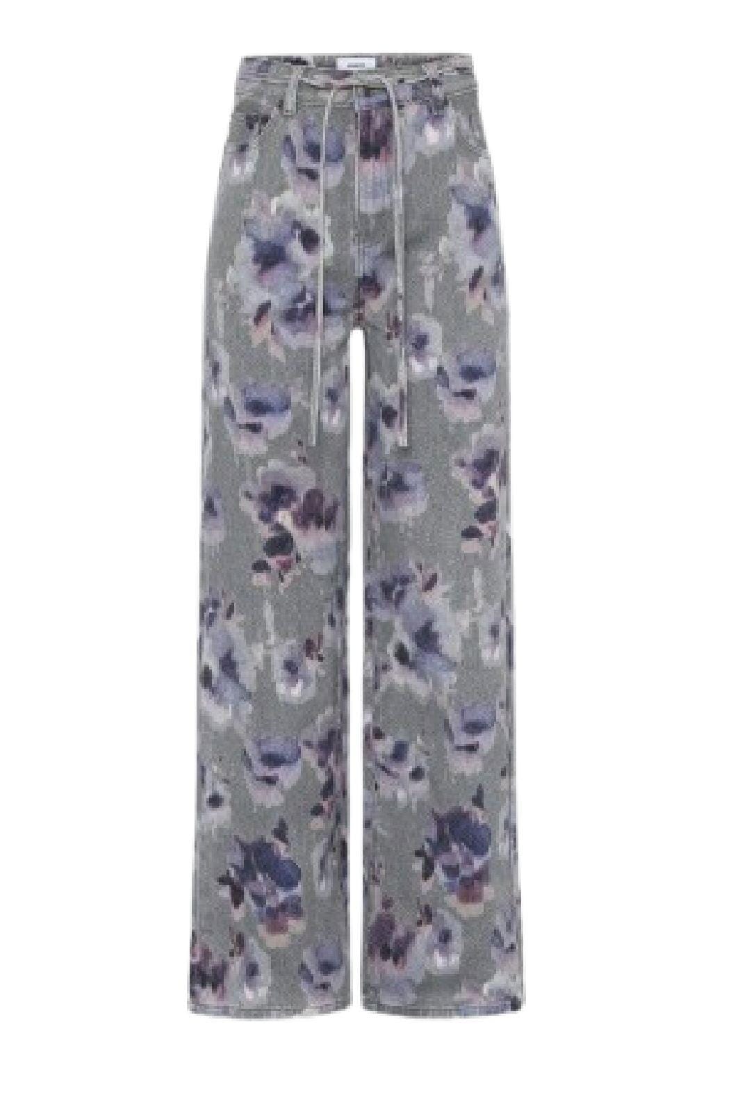 Jeans van Moves by Minimum met een bloemenpatroon in grijs en paars op een grijze achtergrond. De broek heeft een hoge taille met een strik en een losse pasvorm door de benen.
