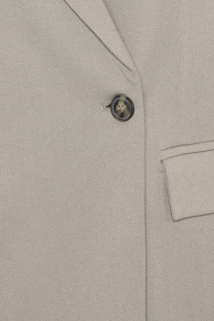 Beige blazer van Moves by Minimum met oversized pasvorm en V-hals. Hij heeft lange mouwen, twee voorzakken en een enkele knoop aan de voorkant.